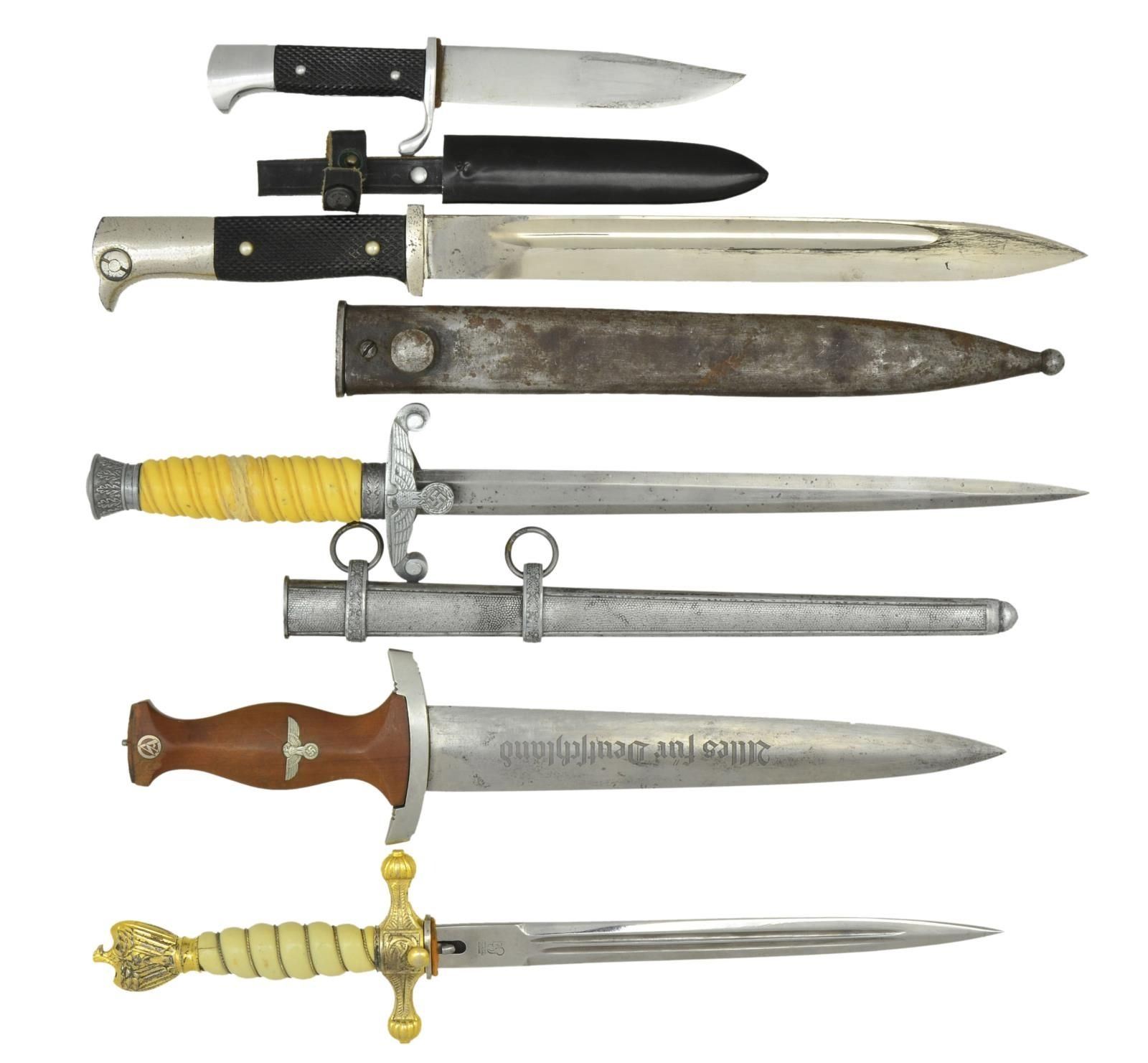 1) SA DAGGER. Overall length: 13 3/8". The blade is etched "Alles fur Deutschland" on the front and is marked "EUGEN SCHEIDT * SOLINGEN-OHLIGS * (logo) E O". Nickel-silver crossguard stamped "Nm" on the reverse. Wooden grip with nickel-silver eagle and brown enameled SA button. No top guard or nut, and no scabbard. CONDITION: blade has a light gray patina with some evidence of light sharpening. Crossguard is undamaged. Grip has chipped at the top. 2) ARMY DAGGER. Overall length: 15 3/4". A plain blade is marked on the reverse: "(tiger) TIGER SOLINGEN." Plated eagle crossguard and oak leaf embellished pommel cap. Iron oak leaf ferrule. Cream-colored grip. Plated scabbard. CONDITION: blade has a light gray patina. Crossguard & pommel have minor bubbling to the surface. The grip has a glued repair in the center. Scabbard has a light mottled patina. 3) NAVY DAGGER. Overall length: 14 1/8". A reproduction Kriegsmarine dagger with a plain, double-fullered blade stamped on the reverse: "(squirrel) ORIGINAL EICKHORN SOLINGEN." Gold-plated crossguard with eagle pommel. Wire-wrapped cream-colored grip. No scabbard. CONDITION: blade has a bright finish. Hilt has some loss of gold plating. The grip has a tiny crack just below the pommel. 4) ARMY DRESS BAYONET. Overall length: 15 5/8". The blade has a plated finish and is unmarked. Plated hilt with a 2-piece black composite grip. Iron scabbard. CONDITION: blade has wear to its finish, particularly near the hilt. Hilt has minor bubbling to its finish, and the quillon is broken off. Grips are undamaged. Scabbard has been stripped of its finish and has begun to oxidize. 5) GERMAN YOUTH KNIFE. Overall length: 8 1/4". A smaller version of the HJ knife of similar style in different proportions. Plain, unmarked blade. Aluminum guard & hilt. 2-Piece black composite grips. Black enameled scabbard with an integral back leather belt loop. CONDITION: light wear overall. (02-21870/BF). $400-600.