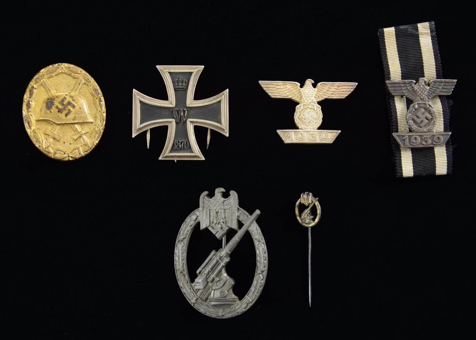 This lot contains items of questionable authenticity that may be of post-WWII manufacture. We encourage interested parties to examine items in this lot closely and in person, if possible. Preview times are available upon request. 1) FLAK BADGE. A WWII-style German Army Flak Badge in zinc depicting an oak leaf wreath with a Wehrmacht eagle at the top and an anti-aircraft gun in the center. The reverse has a narrow, vertical pin and is stamped "L/58". This badge comes with a matching stickpin featuring a knurled pin. (02-22526/BF). 2) WOUND BADGE. A nice example of a WWII-style German solid Wound Badge in gold. Badge depicts a laurel wreath with crossed swords in the center, superimposed by an M35-style helmet with a party symbol on the side. The reverse has a wide, vertical pin and is marked "L/14". This badge is housed in its black leatherette case with a cream-colored lining. (02-22535/BF). 3) IRON CROSS. A seldom-seen example of a 1st Class Iron Cross from the Franco-Prussian War period. Cross shows a silver-bordered black cross with a crown at the top, "W" in the center, and "1870" at the base. The reverse has a narrow central pin with a humped pin on each side to stabilize the cross. The reverse is stamped "GODET". (02-22556/BF). 4) SPANGE. A fine example of a WWII-style German Spange. The silvered badge depicts a political eagle atop an inverted trapezoidal bar with the date "1939". The reverse has a vertical, wide pin and is stamped "L21". (02-22556/BF. 5) SPANGE. A good example of a WWII-style German Spange. The darkened silver badge depicts a political eagle atop an inverted trapezoidal bar with the date "1939". The reverse has four flat pins and is attached to a WWI Iron Cross ribbon. (02-22556/BF). CONDITION: all badges generally show light wear with no notable damage. $400-600.