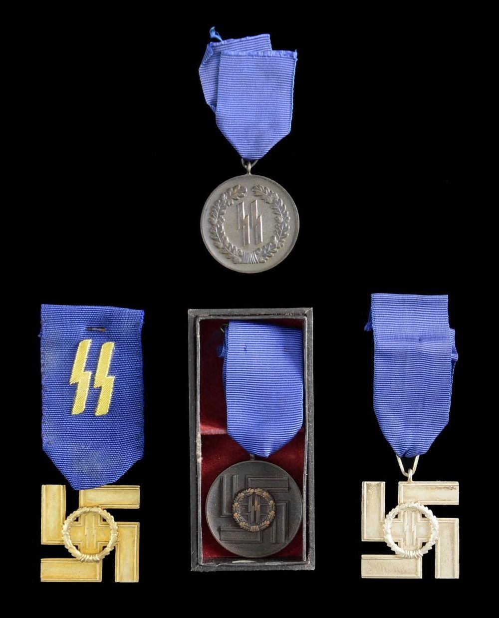 This lot contains items of questionable authenticity that may be of post-WWII manufacture. We encourage interested parties to examine items in this lot closely and in person, if possible. Preview times are available upon request. 1) 12 YEAR. This WWII German 12 Year SS Long Service Medal depicts a large silver party symbol with a central wreath encircling SS runes. The reverse reads "FUR TREUE DIENSTE IN DER SS". Plain cornflower blue ribbon measuring 1 1/8" in width. (02-22550/BF). 2) 25 YEAR. This WWII German 25 Year SS Long Service Medal depicts a large gilded party symbol with a central wreath encircling SS runes. The reverse reads "FUR TREUE DIENSTE IN DER SS". Cornflower blue ribbon measuring 1 1/2" in width with 1 1/8" tall gold bullion SS runes embroidered on the face. (02-22551/BF). 3) 8 YEAR. This WWII German 8 Year SS Long Service Medal is a bronze disc that depicts a party symbol with a central wreath encircling SS runes on the face. The reverse reads "FUR TREUE DIENSTE IN DER SS" superimposed over a large "8". Plain cornflower blue ribbon measuring 1 1/8" in width. This medal is housed in a black presentation box with a burgundy interior and embossed silver SS runes on the cover. (02-22552/BF) 4) 4 YEAR. This WWII German 4 Year SS Long Service Medal is a bronze disc that depicts a party symbol with a central wreath encircling SS runes on the face. The reverse reads "FUR TREUE DIENSTE IN DER SS" superimposed over a large "4". Plain cornflower blue ribbon measuring 1 1/8" in width. (02-22553/BF). CONDITION: all four medals generally show light wear. The presentation box shows moderate wear with a loss of the black covering at the top of the lid. $400-600.