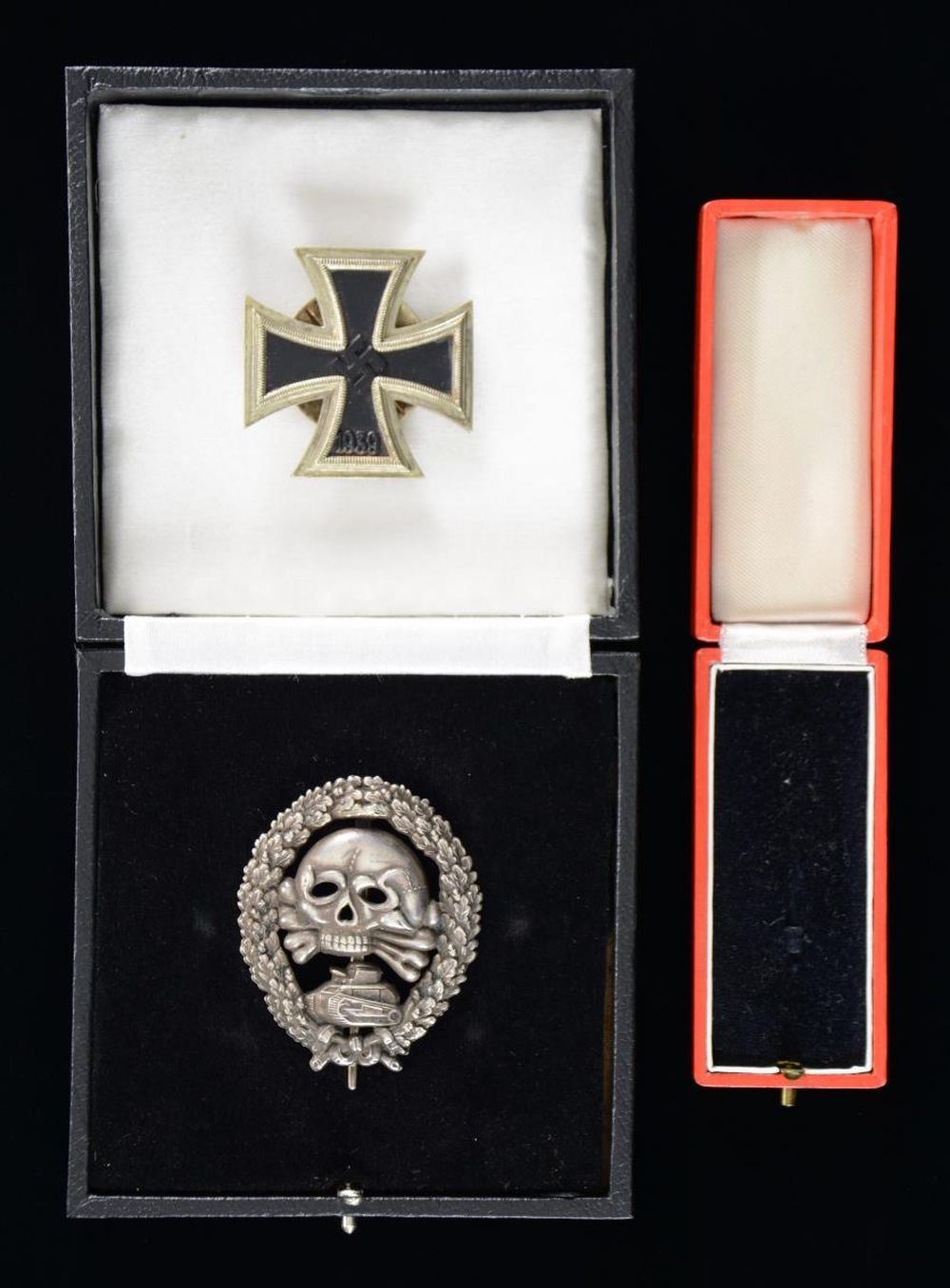 LEGION TANK BADGE, & STICKPIN BOX. This lot contains items of questionable authenticity that may be of post-WWII manufacture. We encourage interested parties to examine items in this lot closely and in person, if possible. Preview times are available upon request. 1) IRON CROSS. A WWII-style German 1st Class Iron Cross featuring a silver-bordered black cross with a central party symbol and "1939" at the base. The cross has a magnetic center, and the reverse has a screw-on disc attachment with a stabilization pin below. The outside of the disc is marked "L21". 2) TANK BADGE. A well-done example of a pre-WWII-style stamped Condor Legion Tank Badge in silver. Badge has a large oak leaf wreath with an oversized central skull & crossbones and a tank below. The reverse has a wide pin and is unmarked. The badge is housed in a black leather-covered case. 3) BOX. A red leather stickpin box with a gold-impressed label on the side that reads "LEHMANN & WUNDENBERG HANNOVER". No stickpin. CONDITION: all awards show light overall wear. Boxes also show light overall wear. (02-22565-1/BF). $350-600.