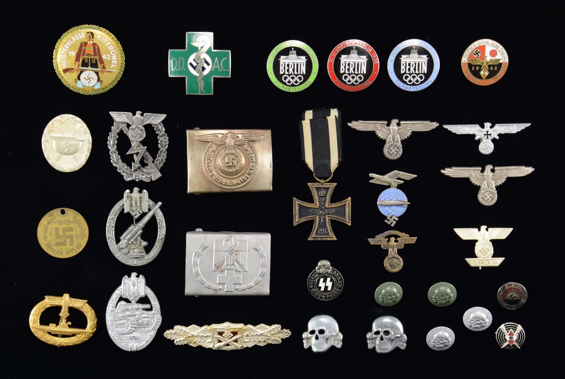 INSIGNIA. It is our opinion that items in this lot are of post-WWII manufacture. Please feel free to examine these items in person to see if you agree with our assessment. This lot consists of 1 enlisted Red Cross belt buckle. / 1 Enlisted SS belt buckle. / 1 Green enamel DDAC Medical Badge. / 4 Death’s head clothing buttons. / 2 Sets of SS cap eagles and death’s head devices. / 1 Spange with a wide pin on the reverse. / 1 Officer’s enamel cap badge for a zeppelin crew. / 3 Enameled badges for the 1936 Olympics, showing "BERLIN" and the Olympic rings in the center. / 1 Silver Wound Badge. / 1 German-Japanese 1942 enamel badge. / 1 HJ shooting badge. / 1 HJ workers’ badge. / 1 NSKK cap eagle. / 1 Army Flak Badge. / 1 Army Ground Assault Badge. / 1 Army Tank Assault Badge. / 1 Large Shooting Association Badge, dated 1943. / 1 Submarine Badge, marked on the reverse "SCHWERIN BERLIN 68". / 1 Veterans’ cap eagle. / 1 WWI 2nd Class Iron Cross, with ribbon. / 1 Silver Close Combat Badge. / 1 SS Loyalty Badge. / 1 Adolf Hitler 1943 token. CONDITION: all items generally show light wear. (02-23213-5/BF). $300-500.