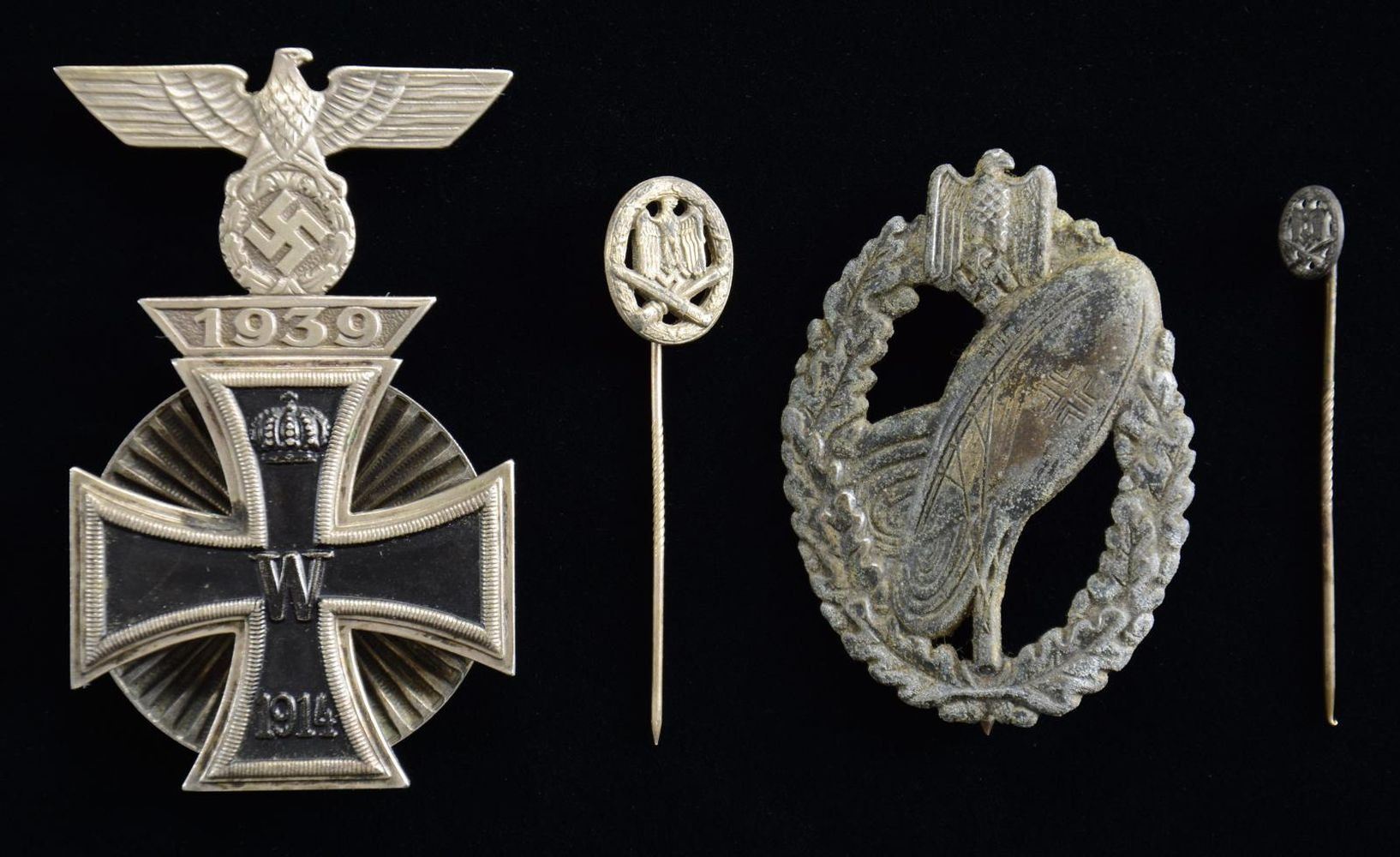 STICKPINS, & A WWI 1st CLASS IRON CROSS WITH SPANGE. This lot contains items of questionable authenticity that may be of post-WWII manufacture. We encourage interested parties to examine items in this lot closely and in person, if possible. Preview times are available upon request. 1) BALLOON. A seldom-seen WWII German Balloon Observer’s Badge. This stamped badge features an oak leaf wreath with a Wehrmacht eagle at the top and a central Observer’s balloon. The badge appears to have, at one time, had a silvered finish. The reverse has a narrowed pin. (02-22528/BF). 2,3) STICKPINS. Two small stickpins featuring a General Assault Badge. Pins have knurling in the center. (02-22528/BF). 4) IRON CROSS. A WWI 1st Class Iron Cross with a non-magnetic center and an integral Spange attached to the top. The reverse has a screw-on rayed circular device for attachment, and the Spange has a small pocket clip attached. (02-22536/BF). CONDITION: the Balloon Badge has an oxidized finish, both on the front and the reverse. Stickpins show light wear. Iron Cross also shows light wear with some tarnish to the silver. $300-500.
