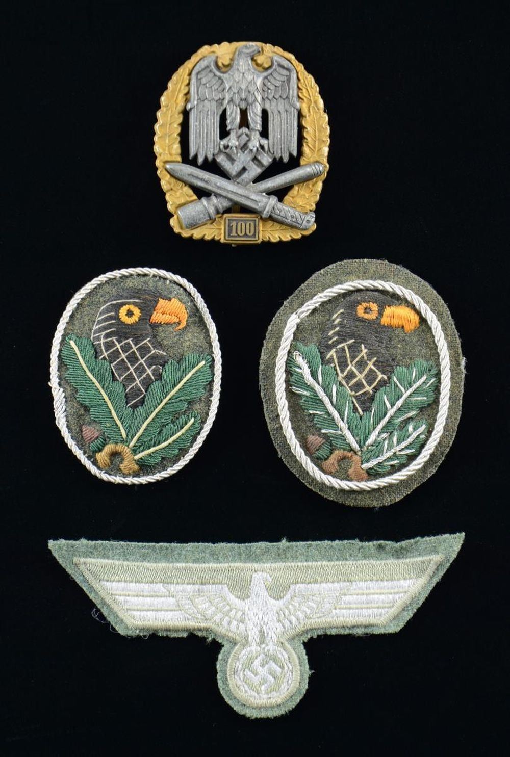 SNIPER'S BADGES, & AN NCO BREAST EAGLE. This lot contains items of questionable authenticity that may be of post-WWII manufacture. We encourage interested parties to examine items in this lot closely and in person, if possible. Preview times are available upon request. 1) GENERAL ASSAULT. A rare "100 Assault" General Assault Badge featuring a gilded brass oak leaf wreath with an exceptionally large silvered Wehrmacht eagle covering the top and center. The base has a small rectangle housing a gilded brass "100" just below a crossed bayonet and stick grenade. The reverse has a wide pin with 4-rivet construction and the side of the wreath is marked "JFS" in a rectangle. (02-22524/BF). 2) SNIPER. An embroidered WWII German Sniper’s Badge with silver bullion border and highlights. The reverse of the badge is stenciled "B & N BERLIN". (02-22529/BF). 3) SNIPER. An embroidered WWII German Sniper’s Badge with silver bullion border. The reverse appears to be stiffened black cotton. (02-22529/BF). 4) BREAST EAGLE. An unissued NCO grade German Wehrmacht breast eagle with flat silver bullion on dull olive green all sewn to field green wool. (02-22529/BF). CONDITION: badge shows light wear overall. Both Sniper’s Badges appear unissued but are obviously by different manufacturers. Breast eagle shows some degradation to the bullion. $300-400.