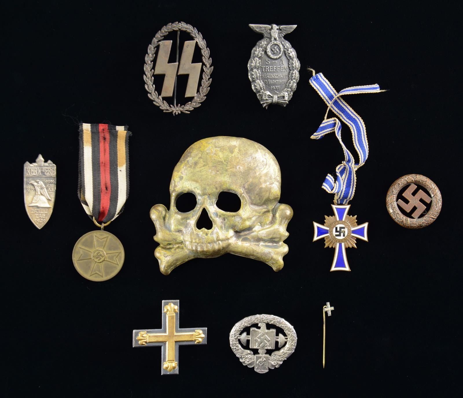 This lot contains items of questionable authenticity that may be of post-WWII manufacture. We encourage interested parties to examine items in this lot closely and in person, if possible. Preview times are available upon request. This varied lot includes 1 Baltic Cross of the National Baltic Congress. Cross shows a gilded cross with fleur de lys at the ends on a silvered background. The reverse has a wide pin. / 1 Stickpin for a Baltic Cross with a plain pin. / 1 Bronze Mother’s Cross with ribbon. / 1 War Merit Medal with a stained ribbon. / 1 Hussar’s death’s head cap badge. / 1 Nuremburg Party Rally Badge of 1929. The reverse is marked "ROFFSTATTER BONN GES.GESCH." / 1 Heavy Athletics Sports Badge, 2nd Model. The reverse has a narrow pin and is unmarked. / 1 Badge of the SA meeting at Brunswik, 1931. / 1 Dutch SS Sports Badge. Badge shows a laurel wreath with a large central "SS". The reverse has a narrow pin and is heavily stamped "SS529". / 1 Gau Munchen Badge, 1933. CONDITION: all items generally show light wear, except as noted. (02-22564/BF). $250-400.