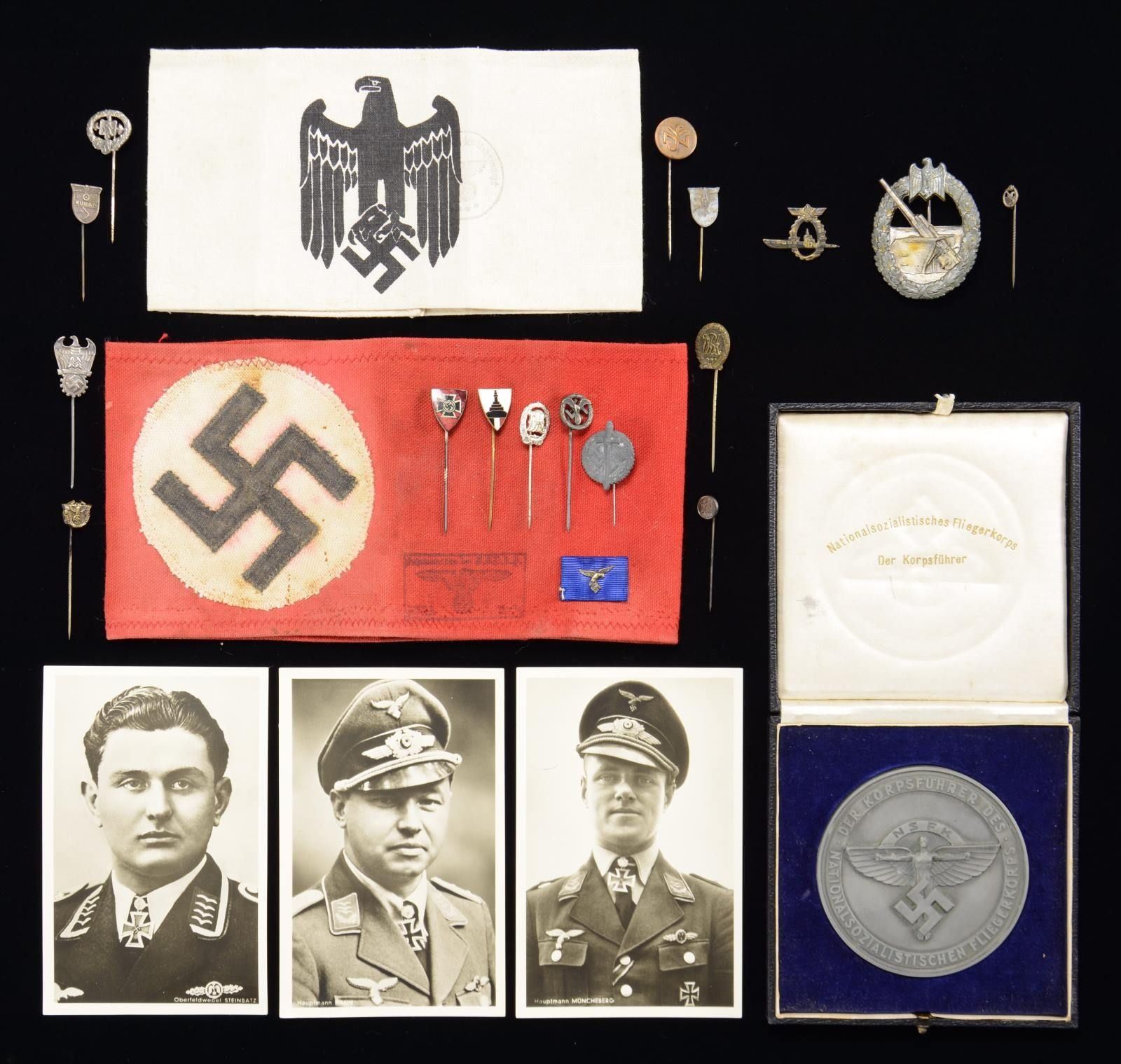 AWARDS, & MORE. This lot contains items of questionable authenticity that may be of post-WWII manufacture. We encourage interested parties to examine items in this lot closely and in person, if possible. Preview times are available upon request. 1) STICKPINS. Lot of 13 WWII-style German stickpins that include, but are not limited to, the Krim shield, DRL Sports Badge, Sudetenland Medal, Todt, Kuban, Veteran’s, Heavy Sports, and more. This lot also includes a Luftwaffe Long Service ribbon bar with no pin. (02-22566/BF). 2) ARMBANDS. One homemade party armband and one Wehrmacht eagle armband. (02-22566/BF). 3) POSTCARDS. Three photographic postcards of Luftwaffe Knight’s Cross winners. (02-22566/BF). 4) DESK MEDAL. A fine example of an NSFK Desk Medal award measuring 3 1/4" in diameter with an NSFK insignia on the front and the words "DER KORPSFUHRER DES NATIONALSOZIALISTISCHEN FLIEGERKORPS". The reverse reads "DEM SIEGER IM REICHSWETTBEWERB FUR HALLENFLUGMODELLE 1944 DERKORPSFUHRER DES NS-FLIEGERKORPS". The medal is in its original case of issue with a blue velvet base and gold-embossed off-white pillow. (02-22568/BF). 5) COAST ARTILLERY. A scarce example of a WWII-style German Coast Artillery War Badge. Badge has an outer oak leaf wreath with an eagle and party symbol at the top. The center of the badge depicts a Coast Artillery cannon. The reverse has a narrow pin and is marked "F L L" in circles. (02-22593/BF). 6) STICKPINS. This group includes one Coast Artillery War Badge stickpin and one Naval Dock Yard Worker’s Achievement Badge stickpin, with the pin detached but present. (02-22593/BF). CONDITION: all items generally show light wear and are complete. $200-400.