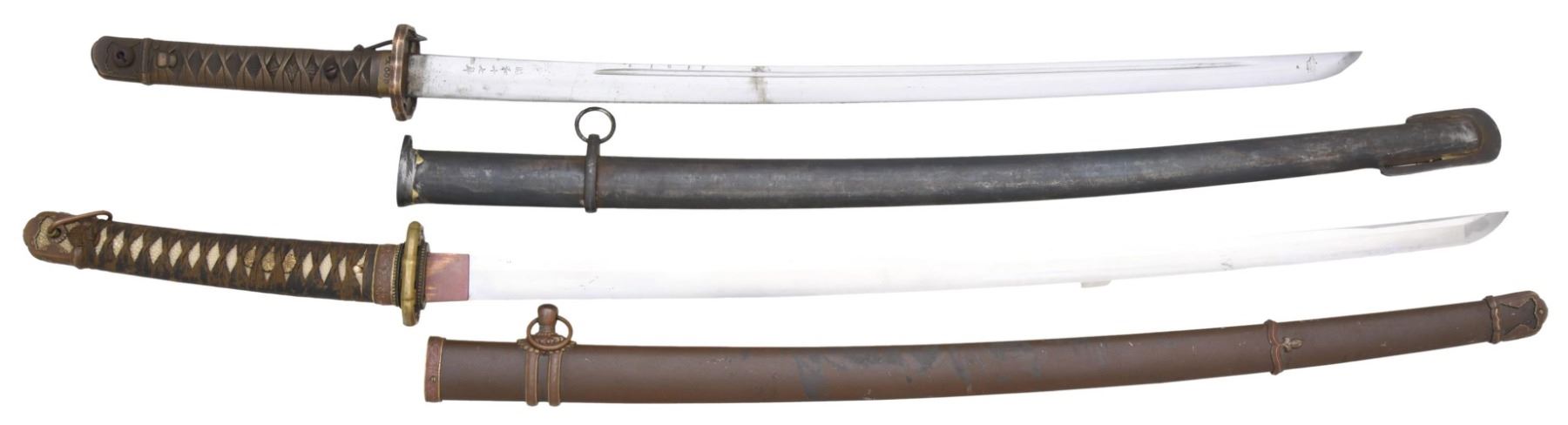 1) Overall length: 37 3/4". Blade length: 25 3/8". Blade has no visible hamon and has a 17 1/2" hi. Above the rear of the hi is the number "27072". At the base of the blade is a 5-character Japanese inscription on one side, and the other side shows a 2-character inscription with a hinomaru-style flag. Plain gilded brass tsuba with a plain brass fuchi showing Kokura Arsenal marks. Solid brass/copper tsuka with integral kabuto-gane. Iron saya. CONDITION: blade has a nice finish but may have been improperly sharpened or just shows late-war workmanship. Tsuka shows light overall wear. Saya shows light wear but typical late-war poor workmanship. 2) Overall length: 39 1/2". Blade length: 28 1/8". Blade has an irregular hamon with a copper habaki. Gilded brass four cherry blossom tsuba with four seppa above and below. The nakago has a single mekugi-ana with an 11-character signature on one side. Matching gilded bronze fuchi and kabuto-gane. Brown tsuka-ito with white same beneath and gilded brass three cherry blossom menuki. Brown-painted iron saya with gilt and bronze gunto. CONDITION: blade has a beautiful, crisp polish. Tsuka and saya show light overall wear. (02-22917-2/BF). $900-1,300.