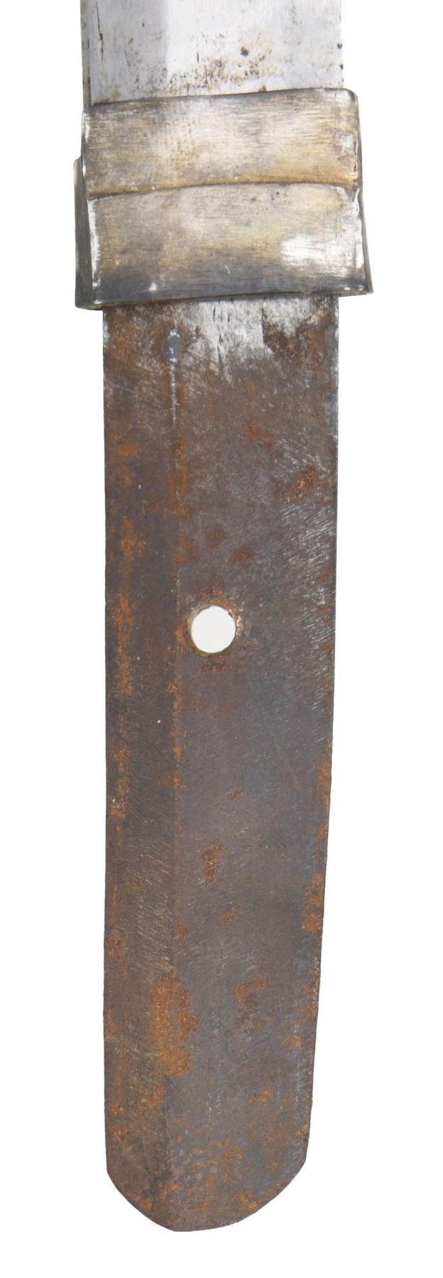 1) KATANA. Overall length: 39”. Blade length: 27 7/8”. Blade has a straight, slightly wavy hamon with a copper habaki. Gilded brass four cherry blossom tsuba with four seppa below and one seppa above. The nakago has one mekugi-ana and no signatures on either side. The tsuka has a matching fuchi and kabuto-gane and has a dark copper-colored tsuka-ito over white same and three cherry blossom menuki. Plated iron saya with a leather covering. CONDITION: blade has a few spots of oxidation that need to be removed and a few very, very shallow nicks to the blade. The tsuka shows wear, and the tsuka-ito is quite frayed. Saya is quite solid, though the leather wrap has one tear and one hole. 2) WAKIZASHI. Overall length: 22 3/4". Blade length: 16”. Blade has a straight hamon with a silver-plated habaki. There is an iron tsuba decorated with bamboo, a frog, and another creature. There are two seppa below and one above. There is no fuchi or kashira. The tsuka is wrapped with light brown tsuka-ito over white same. The menuki appear to be gilded brass dogs or lions. Black enameled wooden saya held together with pacing tape. CONDITION: blade has a good polish. Tsuka shows light wear, but, as stated, the fuchi and kashira are missing. Saya has lost 20% of its finish and shows tape repairs. 3) WAKIZASHI. Overall length: 23 5/8”. Blade length: 15 1/2”. Blade appears to have a faint, straight hamon with a gilded, textured habaki. Plain blackened brass tsuba with a single seppa above and below. Matching gold, black, and bronze fuchi and kashira with a black tsuka-ito over a white same with blackened brass menuki. Wooden saya with fish skin wrap and a central silver mon. There is a pair of chopsticks housed in the side of the saya. CONDITION: blade has been overly cleaned and would benefit from a professional polish. Tsuka shows light wear and is visually quite attractive. Saya has losses but is substantially solid. (02-23218-2/BF). $700-950.