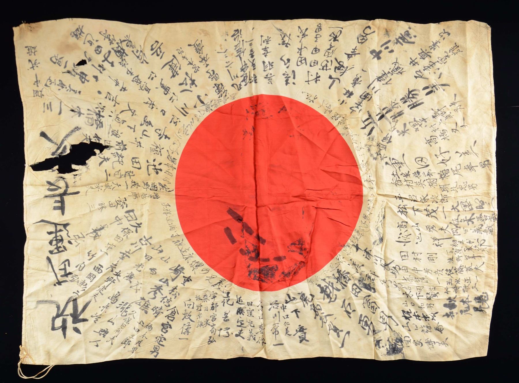 1) BINOCULARS. A fine, large pair of WWII Japanese binoculars in black with a textured covering over the barrels. One side reads "7x7 10’" with a Japanese symbol. The other side reads "SKK NO 363" with Japanese characters. Binoculars have their original cotton carrying strap and are housed in a light blue painted canvas case with numerous Japanese characters in white paint on the front and the name "Vincent, F" in black on the lid. The case has two lens covers in the top and is accompanied by a note that reads "Fay R. Vincent 4th Marines Division Iwo Jima taken from a dead Japan-ese soldier". CONDITION: binoculars appear operable. There are losses to the textured covering on the barrels. The case shows wear but is quite solid. 2) PRAYER FLAG. A large Japanese Hinomaru-style prayer flag measuring approx. 40" x 27". This flag is absolutely covered with Japanese characters. The flag came from the same estate as the binoculars and may have been captured at Iwo Jima. A translation of the many inscriptions may provide insight into the flag’s origin. CONDITION: flag has staining and is a bit yellow with an 8" tear at the top. 3) PRAYER FLAG. A Japanese Hinomaru-style prayer flag measuring approx. 24" x 21 1/2". There are several inscriptions scattered around the flag. CONDITION: flag shows light wear overall. 4) FLAG. A Japanese Hinomaru-style flag measuring approx. 39" x 28". CONDITION: flag shows a few minor stains and is substantially quite solid. (02-23294-2/BF). $600-900.