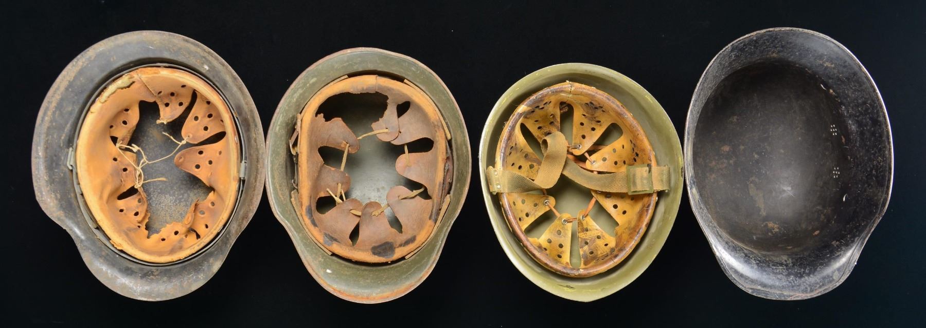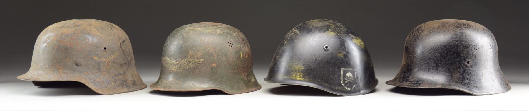 1) LUFTWAFFE. A well-used example of a German M1942 single-decal Luftwaffe helmet. Helmet has a gray/blue painted finish with a Luftwaffe decal on the left-hand side. The interior left is stamped "ET66". The helmet has an original tan leather liner but no chinstrap. CONDITION: the helmet shows heavy wear with approx. 40% of its original painted finish mixed with oxidation, and the decal is about 80%. Liner shows wear with minor losses and a touch of rodent damage. 2) LUFTSCHUTZ. A scarcer example of a police-style Luftschutz helmet in field green paint with a large winged Luftschutz insignia on the front. The interior has no visible stampings but does have a partial liner and chinstrap. CONDITION: painted finish is approx. 70% as is the decal. Liner is reasonably solid but shows losses, likely from rodent damage. Only traces of the chinstrap remain. 3) POLICE. A WWII German police helmet in black paint with no insignia on the exterior. The interior has no markings and is missing its liner, chinstrap, and band. CONDITION: helmet finish is about 80%. 4) ITALIAN. This helmet appears to be a repainted M1933 Italian helmet. The exterior is black with a German party decal on the right side and a death’s head decal on the left. The interior has an 8-tongue leather liner with a cotton canvas chinstrap. CONDITION: it is quite likely this helmet was painted and the decals applied well after WWII. The finish and decals are about 70%. The liner and chinstrap appear to show artificial age. (02-22920-1/BF). $500-700.