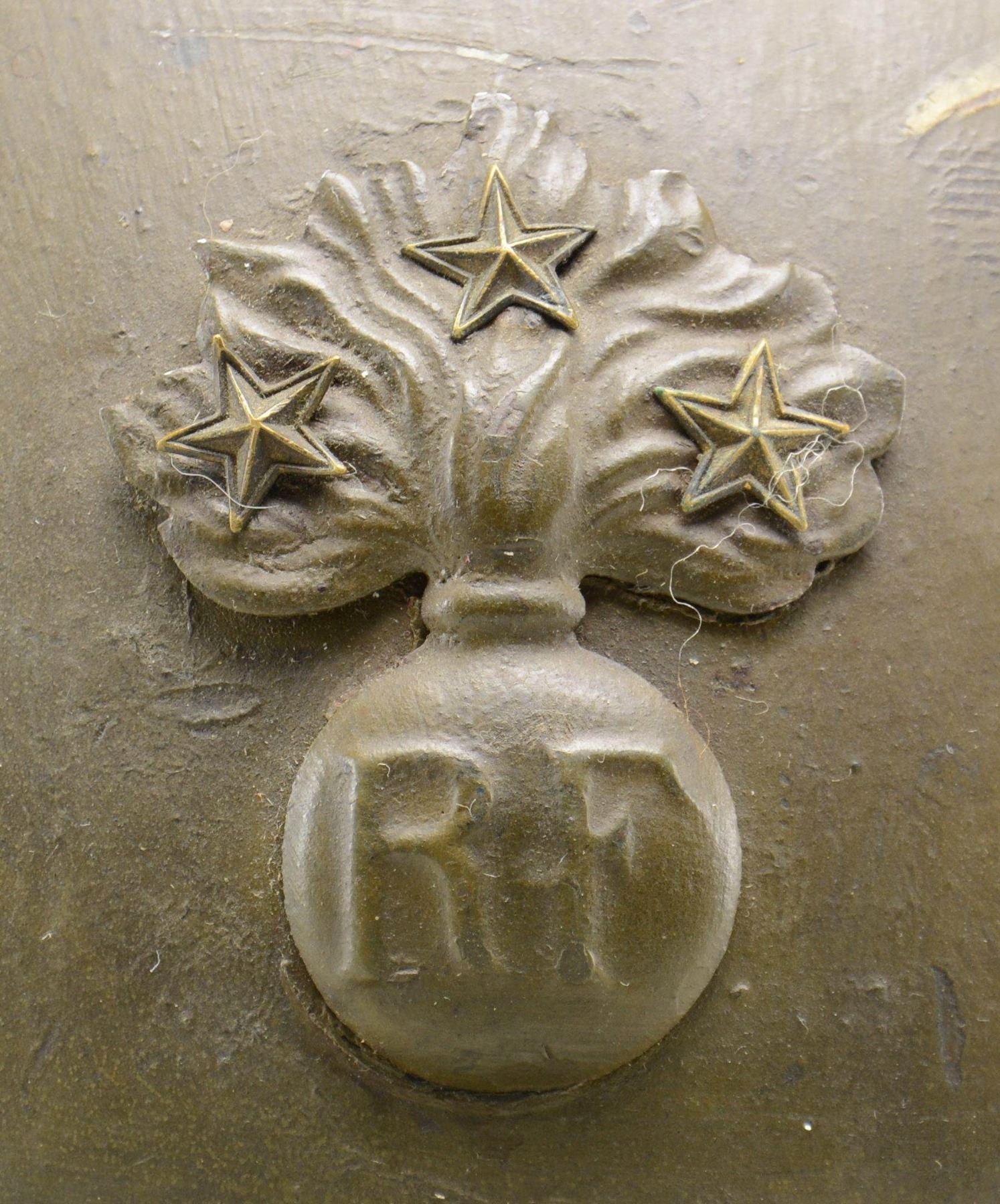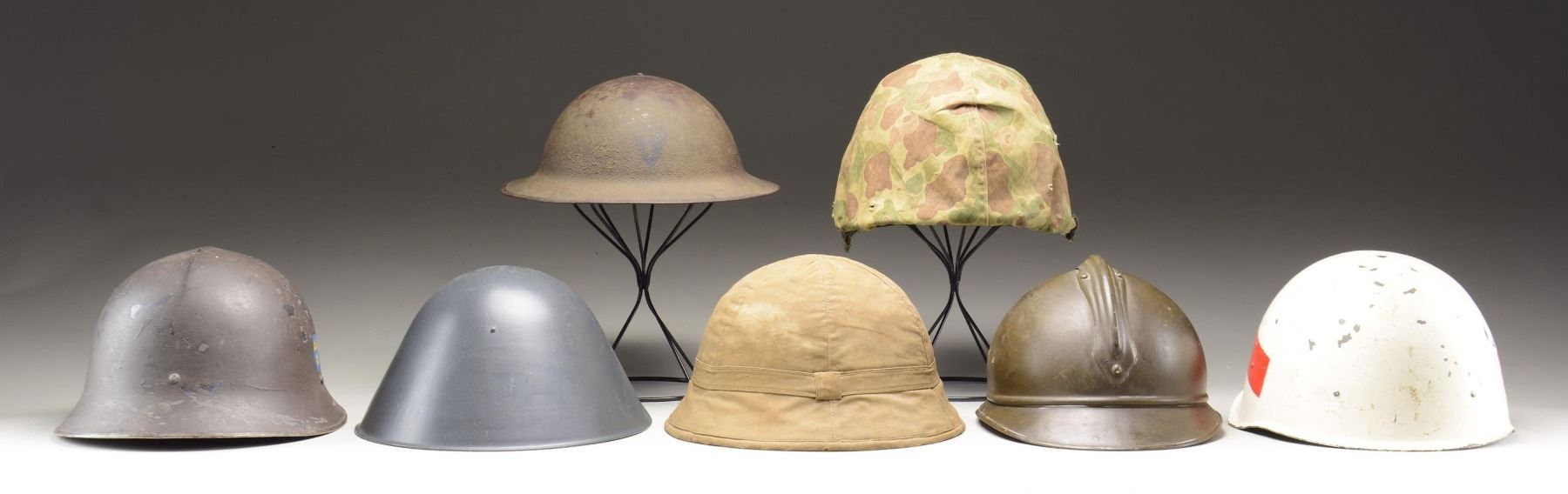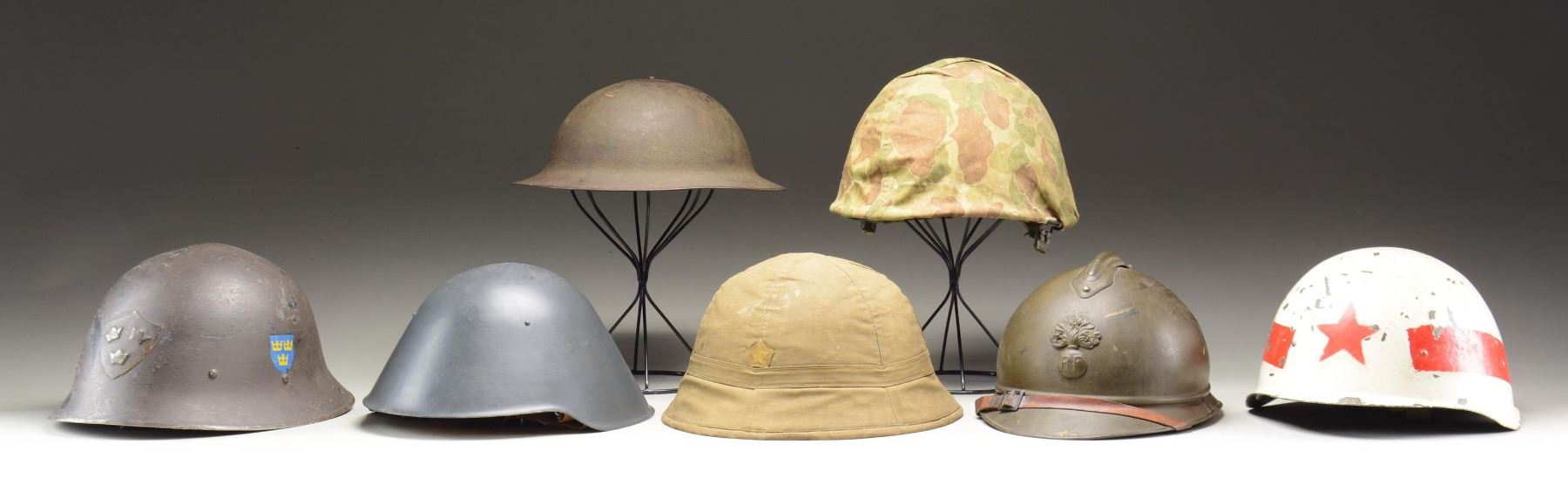 1) FRENCH. A French WWII-style Adrian helmet with a dull field green-painted finish. Helmet has an attached comb at the top. The front plate is a flaming bomb with "RF" at the bottom and three stars at the top. Brown leather chinstrap. Dark brown sweatband with light brown 6-tongue liner. CONDITION: helmet generally shows light wear overall. 2) RUSSIAN. A WWII-style Russian helmet, painted white with red bars and a red star for wear by Soviet military police. The interior maintains its original green finish and has a paint-finished 3-pad liner with a canvas chinstrap. CONDITION: paint is approx. 90%. Liner and chinstrap remain strong. 3) US. An M1917 US "doughboy"-style helmet with a sanded dark green finish and the insignia of the 36th Division painted on the front. Partial liner and no chinstrap. CONDITION: helmet finish is approx. 85%. Painted 36th Division insignia is a bit light but easily discernible. Liner shows moderate wear. 4) US. A rear seam, swivel bail US M1 helmet of the post-WWII period. Helmet has a camouflage cover and correct post-WWII liner with attached chinstrap. CONDITION: helmet shows light wear and is quite solid. Cover has some separations and shows moderate wear. Chinstrap has a few thread-bare areas. 5) SWEDISH. A pre-WWII Swedish helmet with a dark field green-painted finish. Helmet has a blue and yellow Swedish decal on both sides, along with a metal shield front plate with three crowns. Interior shows a leather 3-pad liner and full chinstrap. CONDITION: helmet finish is approx. 90%. Liner and chinstrap are quite solid. 6) EAST GERMAN. A post-WWII East German helmet with a gray/green-painted finish. The interior features a leather liner and 4-contact leather chinstrap. There is foam padding at the front and rear of the helmet. CONDITION: helmet shows light wear overall. 7) JAPANESE. A WWII period Japanese pith helmet with a cotton 6-section, sewn exterior with a gold star sewn to the front. The interior has a cotton tape liner with a sewn cotton chinstrap. There are two interior sewn labels that both have numerous Japanese characters. CONDITION: helmet shows light to moderate wear overall with no significant damage. (02-22734-8/BF). $500-700.