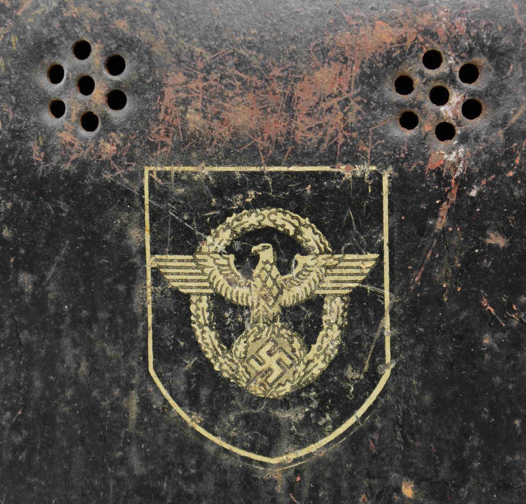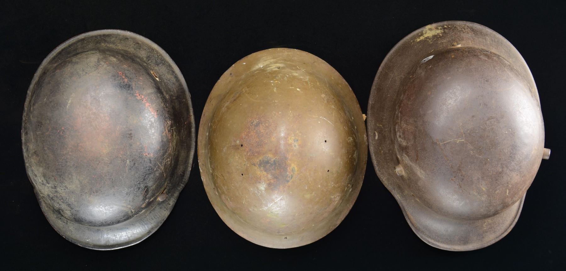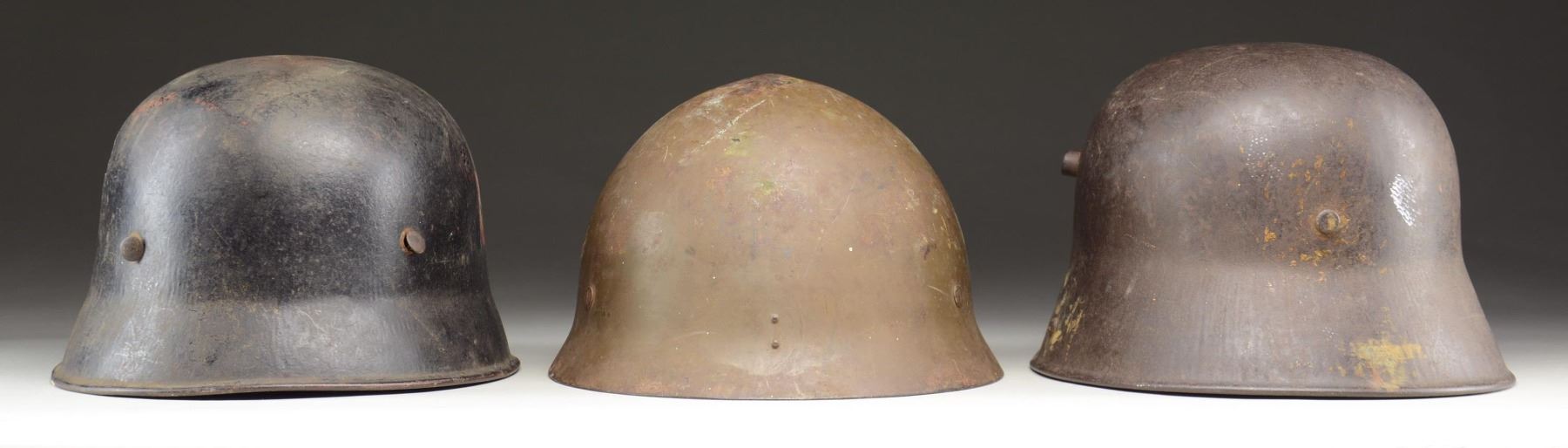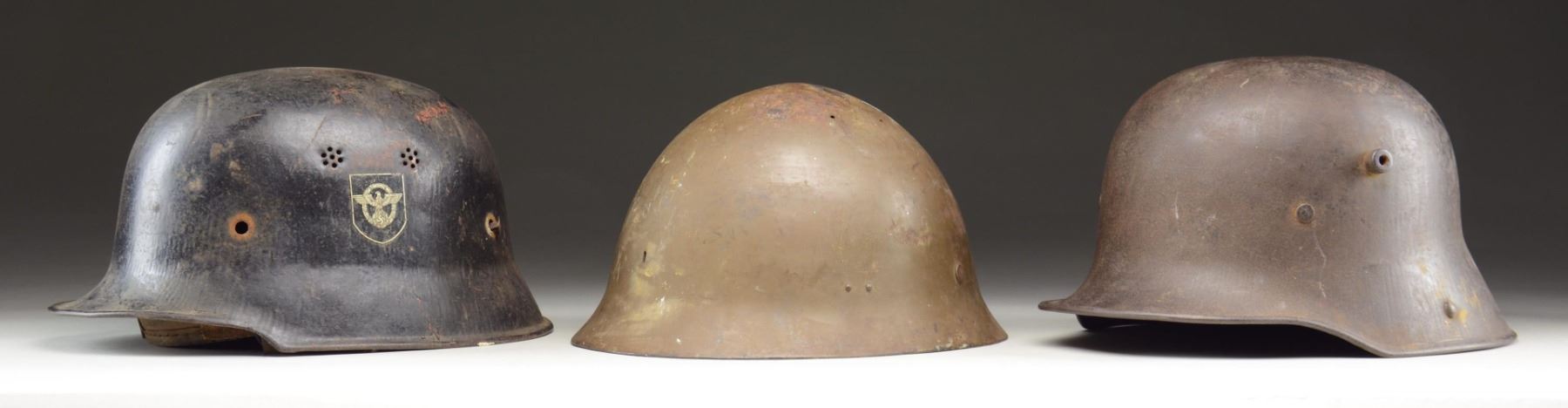 1) JAPANESE. A good WWII Japanese army helmet with a dull OD-painted finish. There is no star on the front, but the hole is present. Complete 3-pad leather liner with cotton tie chinstrap. CONDITION: helmet finish is better than 90%. Liner is slightly detached and separated at one point. Chinstrap is complete. 2) GERMAN. An M1916/17 German WWI helmet with a dark gray/green finish. Helmet has no liner or chinstrap. CONDITION: painted finish shows substantial oxidation. Interior has a similar finish. 3) GERMAN. A WWII German civil police-style helmet with a black-painted finish. There is a police decal on the left side and a Party decal on the right side. Leather liner with an interior crown pad and leather chinstrap. CONDITION: helmet finish is about 80%. Leather liner is about 70%. Chinstrap is present but broken. (02-23212-1/BF). $500-700.
