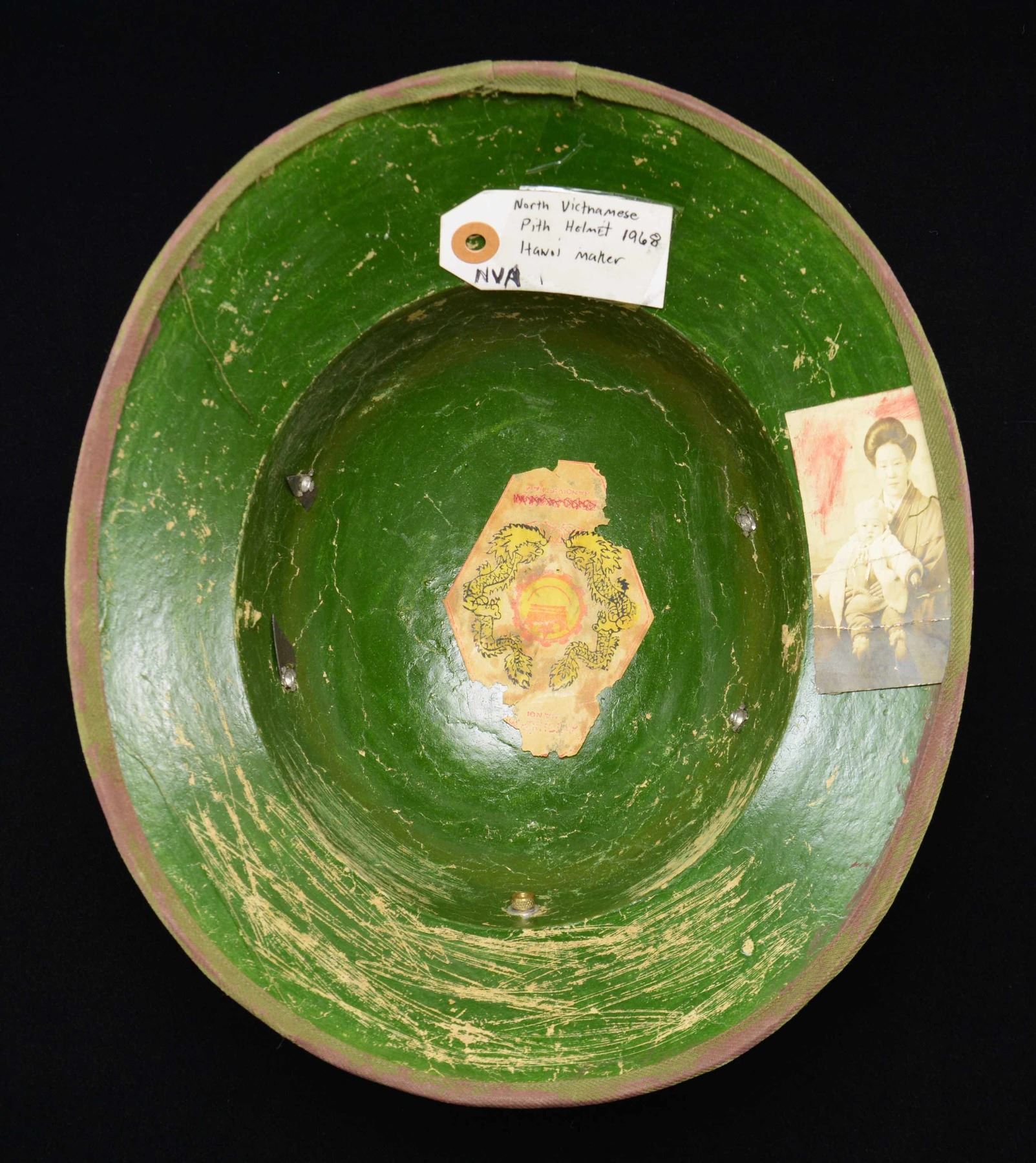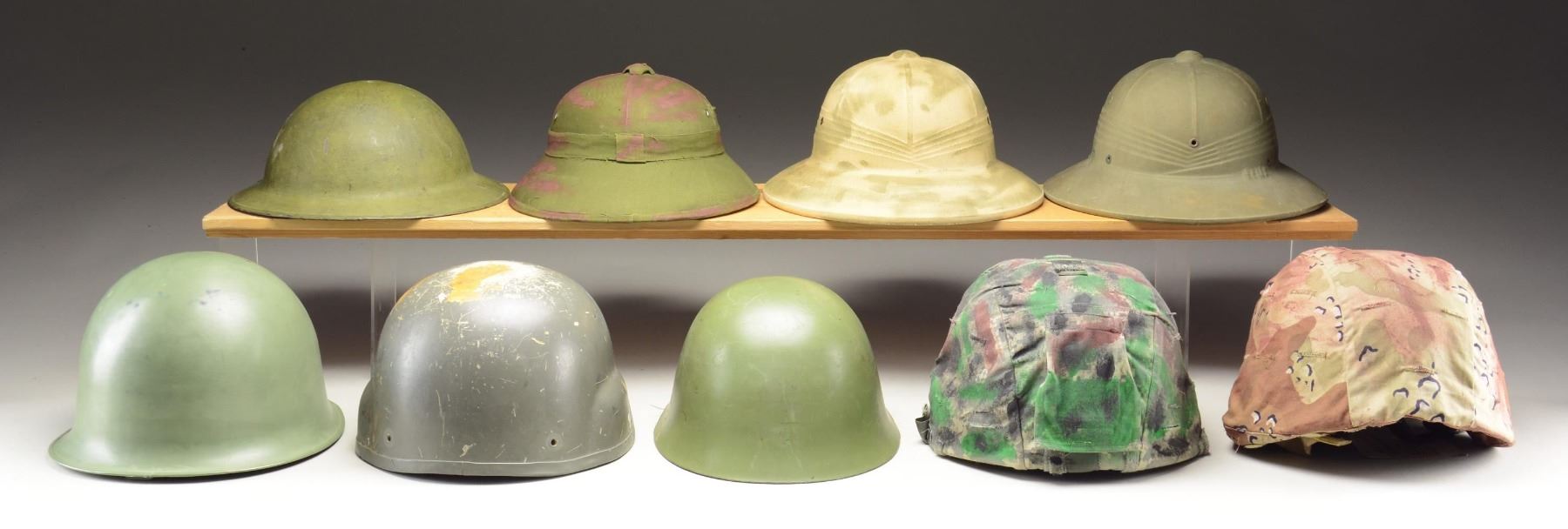 This group of helmets includes 1 post-M1 era ballistic helmet body with a padded liner but no chinstrap. / 1 Post-M1 era ballistic helmet body with padded liner and 4-contact chinstrap with a camouflage cover. The front of the cover has a subdued warrant officer’s bar and an enamel 82nd Airborne insignia. / 1 Post-M1 era helmet body in black plastic with a tan, sanded finish. Helmet has a black nylon liner and a tan desert camouflage cover. This helmet was worn by Corporal Randy Cripe in Afghanistan. / 1 Russian helmet reportedly for a Red Star Ranger paratrooper. Helmet has a green finish with a red star on the front and cotton web liner. / 1 WWI era US M1917 helmet with a green-repainted finish. Helmet has no liner but a complete chinstrap with the soldier’s name written on it. / 1 French helmet with a dark sage green-painted metal exterior and a black plastic interior. The interior liner is marked "P.N. PONT DE BUIS – 1965 -". This helmet comes with an unassociated American camouflage helmet cover. / 1 North Vietnamese pith helmet made of green canvas with red-painted camouflage. Interior is painted green and has a photograph of a woman and baby glued inside. / 1 US khaki-covered pith helmet with green-painted camouflage throughout. The front of the helmet has an infantry collar disc attached. Small faux leather chinstrap with a faux leather sweatband. / 1 USN pith helmet with an olive drab cloth exterior. Interior of the helmet is green and has a brown leather sweatband. The interior is stamped "U S N CONT. N140-62236s-19048B". CONDITION: all helmets show light to moderate wear but appear complete, except as noted. (02-22799-5/BF). $400-600.