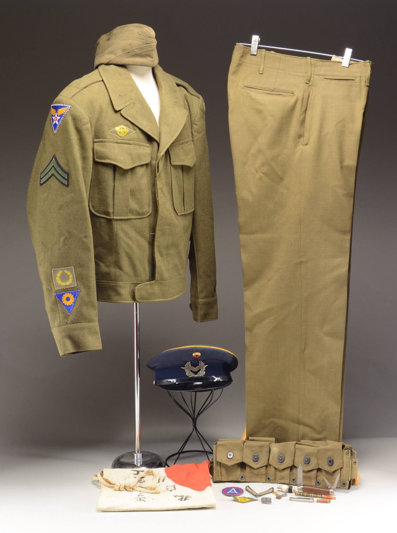 HAT, & MORE. This varied lot consists of 1 WWII 12th Air Force Ike jacket for a Corporal with matching pants and overseas cap. The right sleeve has a 12th Air Force patch, Corporal stripe, Mechanic Specialty patch, and a Meritorious Unit Citation patch. The left sleeve has a Mediterranean Allied Air Forces patch, Corporal stripe, five Overseas Service stripes, and one Two-Year Service stripe. / 1 West German Air Force visor cap with blue crown and band that shows yellow piping at the top. / 1 Cotton WWII Japanese prayer flag, measuring approx. 35 1/2" x 23". / 1 Folding knife measuring approx. 4" closed, marked "SCHRAED WALDEN" on the blade. / 1 Third Army patch. / 1 Private stripe. / 1 Ruptured duck. / 1 Sterling Qualification Badge. / 1 Combination nail file knife. / 4 Plastic-coated military ribbons. / 1 Small khaki bag containing a sewing kit. / 1 USMC 10-pocket cartridge belt. CONDITION: uniform shows nearly no wear. Flag has substantial staining. Other items show light wear. (02-22929-5/BF). $250-400.