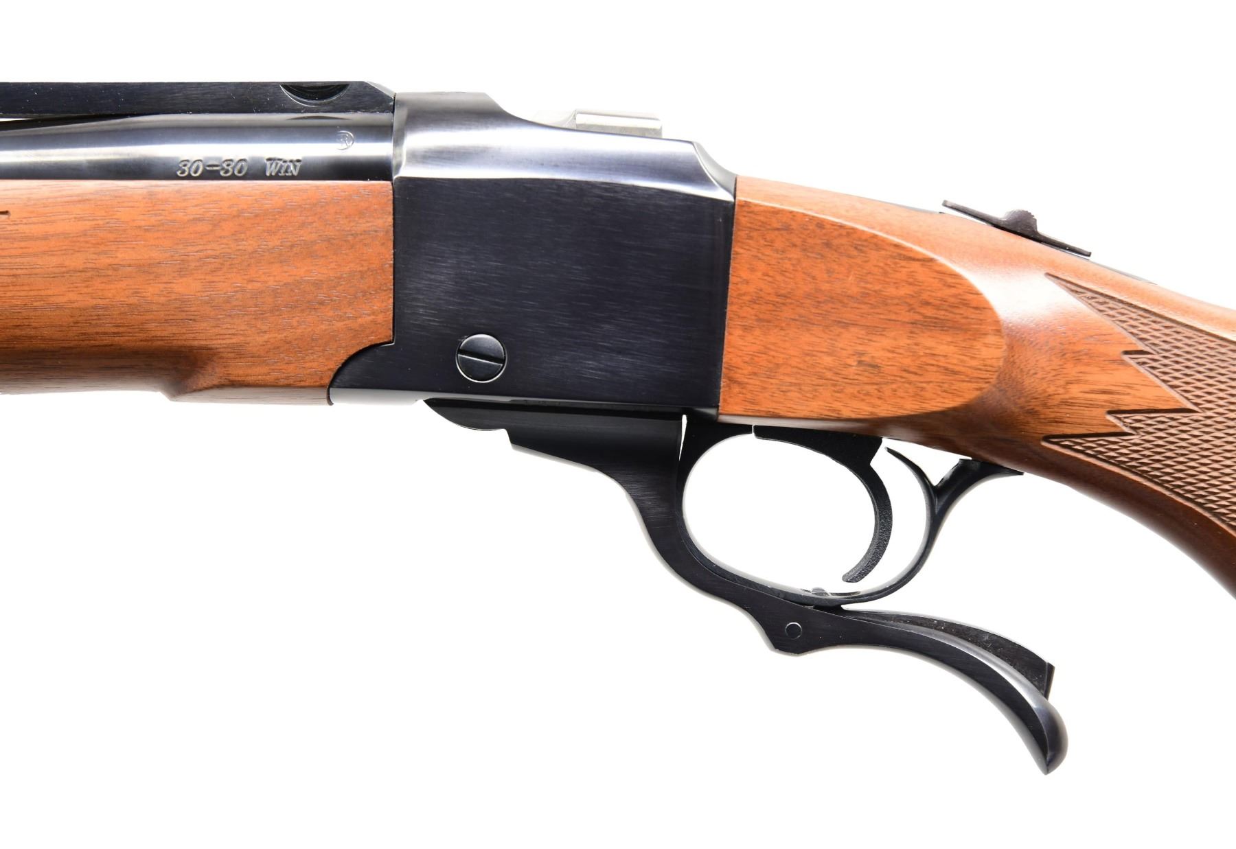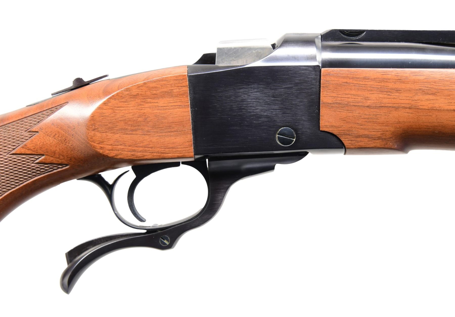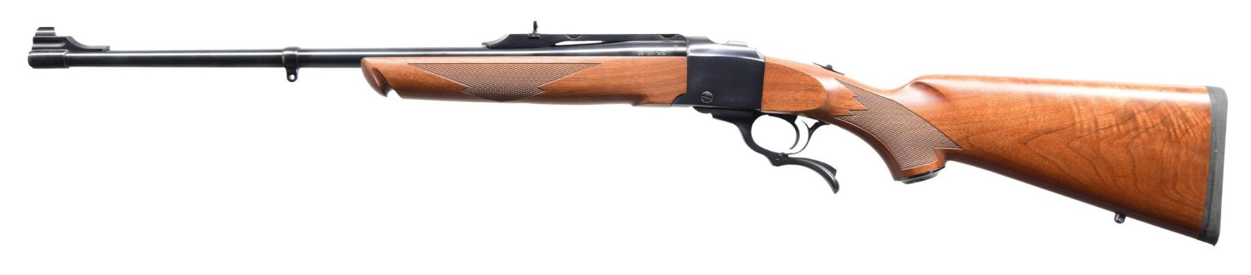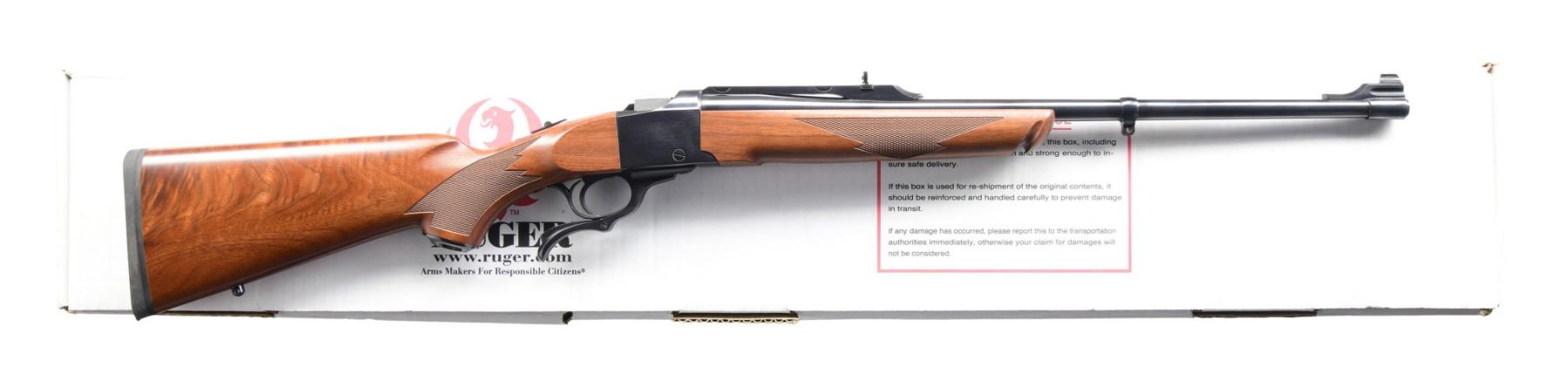 Cal. 30-30 Win. S# 134-27693. Bbl. 22" sporter weight with banded brass bead front sight and folding leaf rear on quarter rib additionally machined for Ruger scope rings. Shipped 2010 as Model 11346 having checkered walnut stock set with Alex Henry forend and nicely figured buttstock plus grip cap, black Ruger rubber pad and sling stud; front swivel base is incorporated into its barrel band. UNATTACHED ACCESSORIES: near excellent original matching numbered box with packaging to include 1" scope rings and detachable swivels. CONDITION: all aspects near excellent appearing new and unfired. PROVENANCE: formerly of the Henry Rodeschin estate; well known, long time Ruger employee who also had subscription number 91. (23-6473/NW). MODERN. $1,500-2,500.