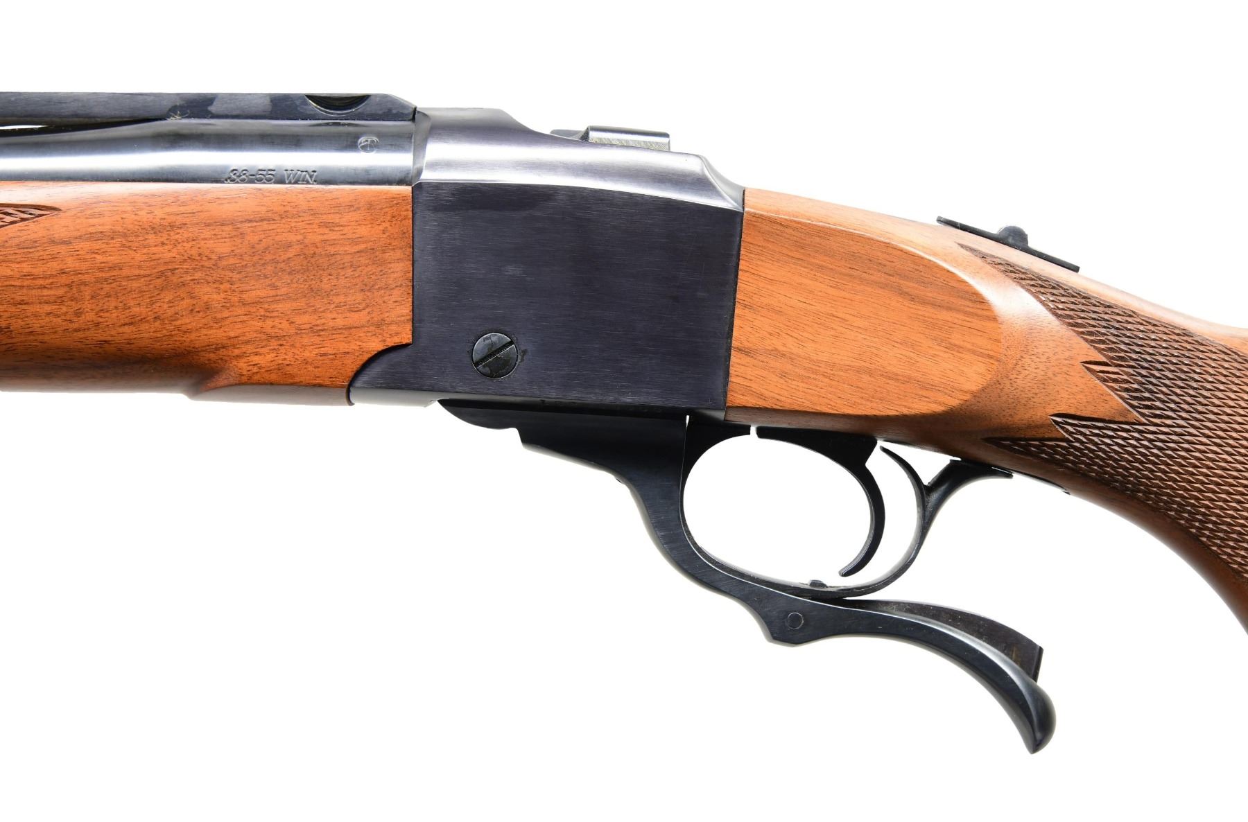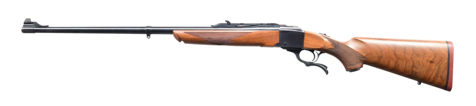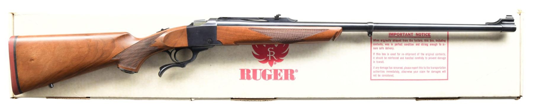 WITH MATCHING NUMBERED MODEL 01372 BOX. Cal. 38-55 Win. S# 132-84909 (1989). Mediumweight 26" barrel with warning marks. Blade front & quarter rib having provision for rings & flip up rear sight. Checkered walnut stock set with Alex Henry forearm. UNATTACHED ACCESSORIES: matching box with packaging to include Ruger rings. CONDITION: all aspects near excellent including bore. (23-6772/MD). MODERN. $1,000-1,500.