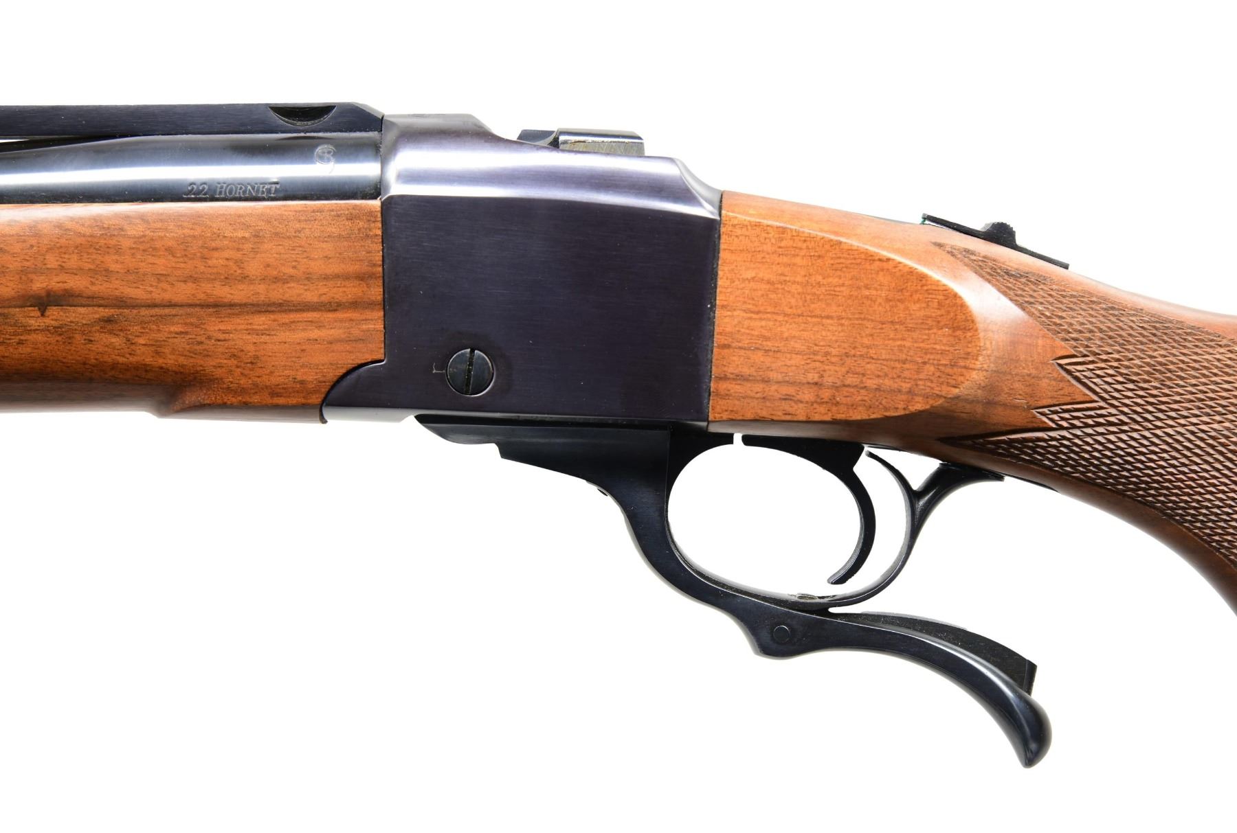 BOX. Cal. 22 Hornet. S# 132-82361 (1987). Model 01344. Lightweight 22" barrel with warning marks. Blade front & quarter rib having provision for rings & flip up rear sight. Checkered walnut stock set with Alex Henry forearm. UNATTACHED ACCESSORIES: Ruger box for S# prefix 132 & 22 Hornet containing packaging. Box shows water stains. CONDITION: all aspects near excellent including bore. (23-6773/MD). MODERN. $1,000-1,500.