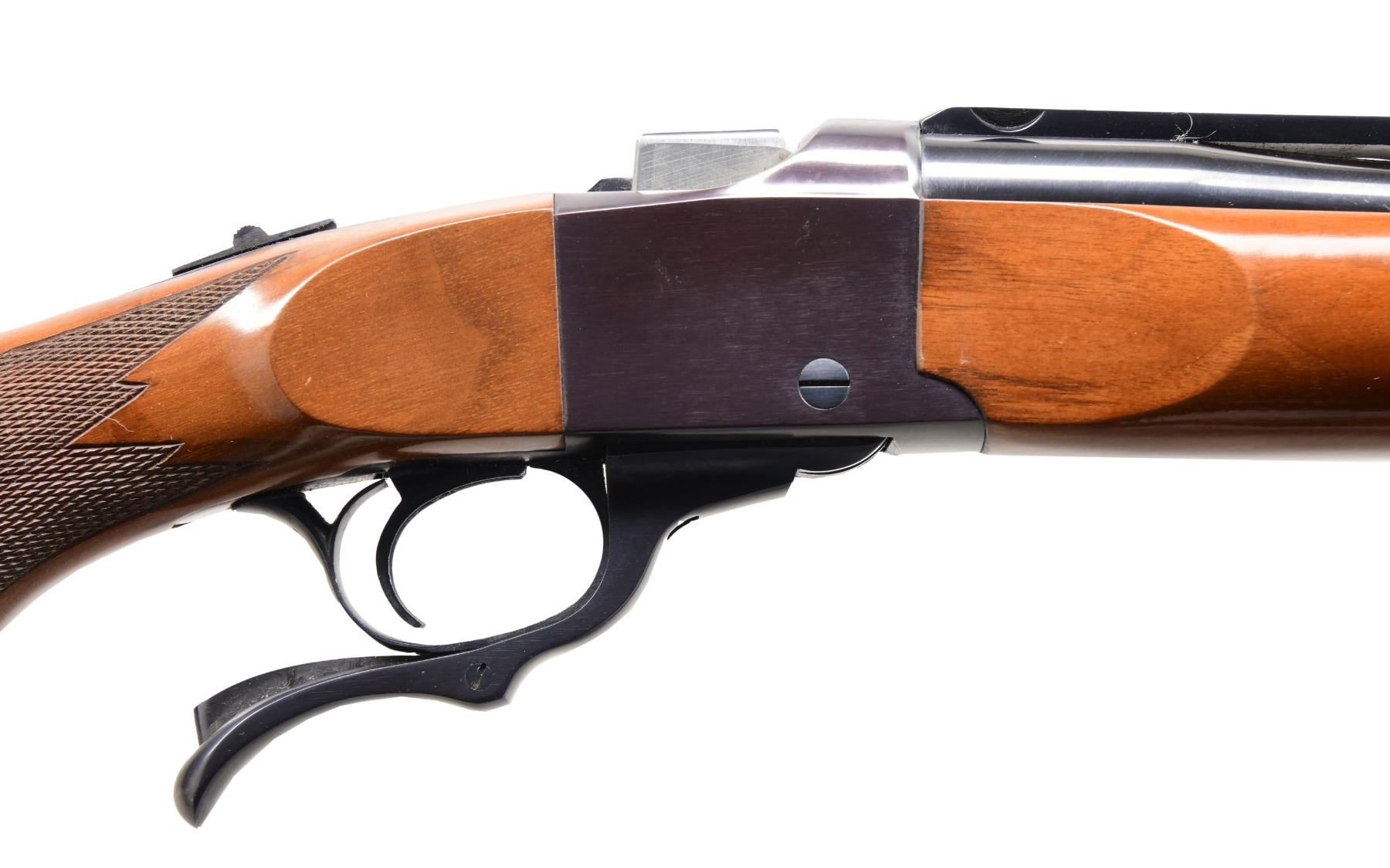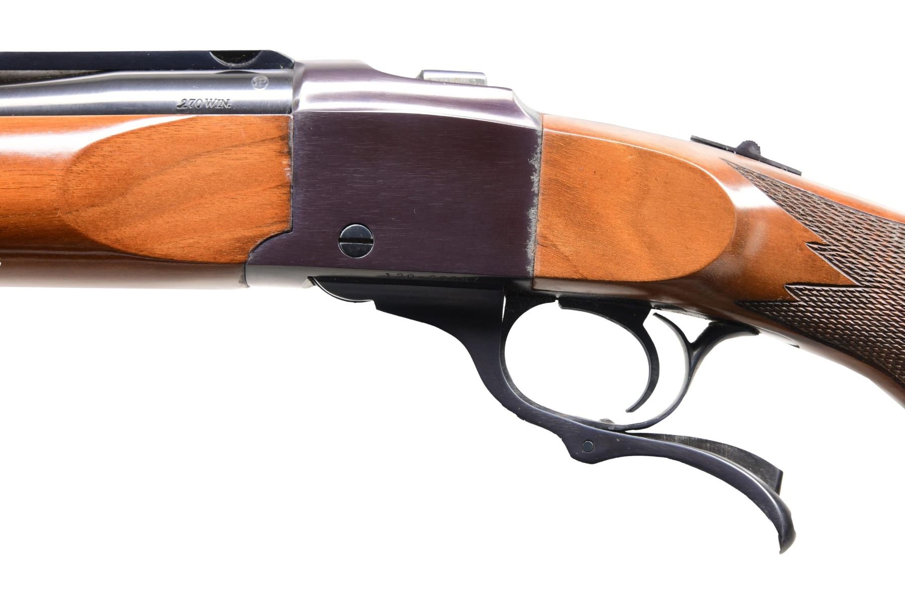Cal. 270 Win. S# 130-29587. Bbl. 26" pre-warning medium sporter weight with Ruger quarter rib machined for factory scope rings. Mfg. 1976 with Bicentennial marking on barrel. Checkered stock set having red pad, grip cap and sling studs; nice figure in buttstock. Forend has been bedded internally around attachment screw area with Microbed. CONDITION: small line of finish loss on upper left side of forend and along bottom where it meets the receiver due to likelihood of "salt wood" walnut with line of oxidation at left rear of receiver yet no finish issues to stock. One very small metallic impact mark on barrel just forward of forend. Balance of rifle is near excellent including bore. (23-6870/NW). MODERN. $750-1,000.