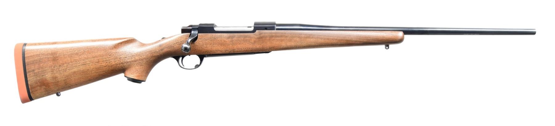 RIFLE. Cal. 30-06. S# 71-62094. Bbl. 22" without provision for sights and no "warning marks". Mfg. 1975 (1968-1992) with refinished walnut stock having checkering removed, red 1" Pachmayr Decelerator pad (13 1/2" LOP), grip cap and sling studs. Interior was bedded for full length of barrel plus recoil lug, then barrel portion was removed and small pad of bedding now at rear of barrel only. Very unusual in that it is a round top receiver WITHOUT provision for iron sights; most round tops were WITH factory iron sights as ST models. CONDITION: very good appearance with occasional faint marks on original metal finishes. Professionally fitted pad. Somewhat rough barrel channel has ample wood to create a more professional clearance profile. Near excellent bore. No plug screws at base mounting area of receiver. (24-2823/NW). CURIO. $350-500.