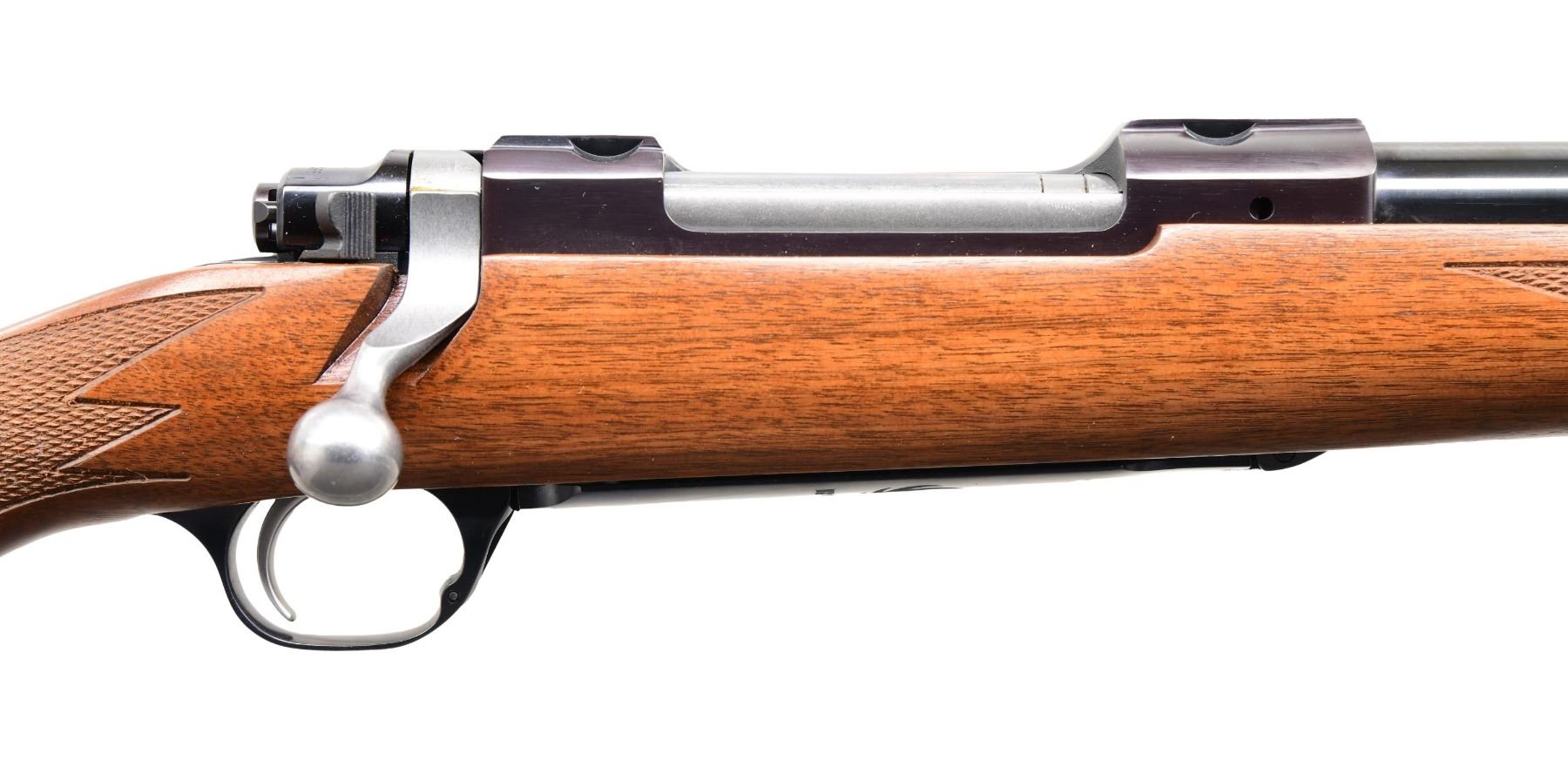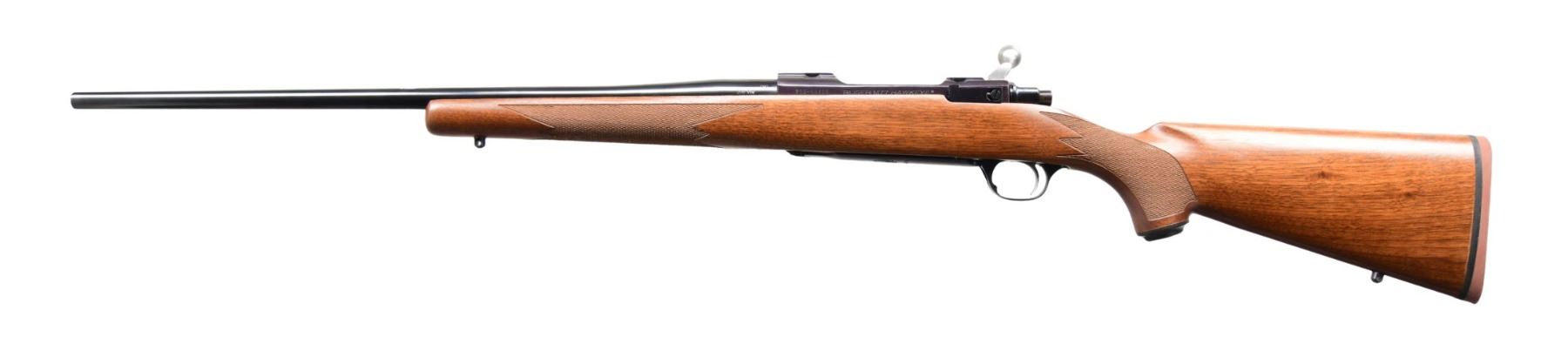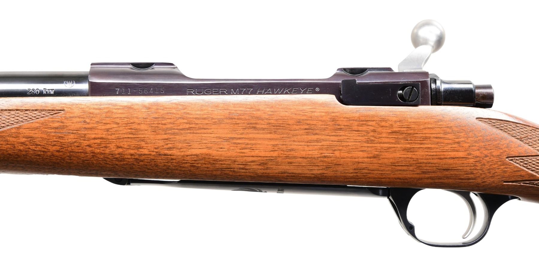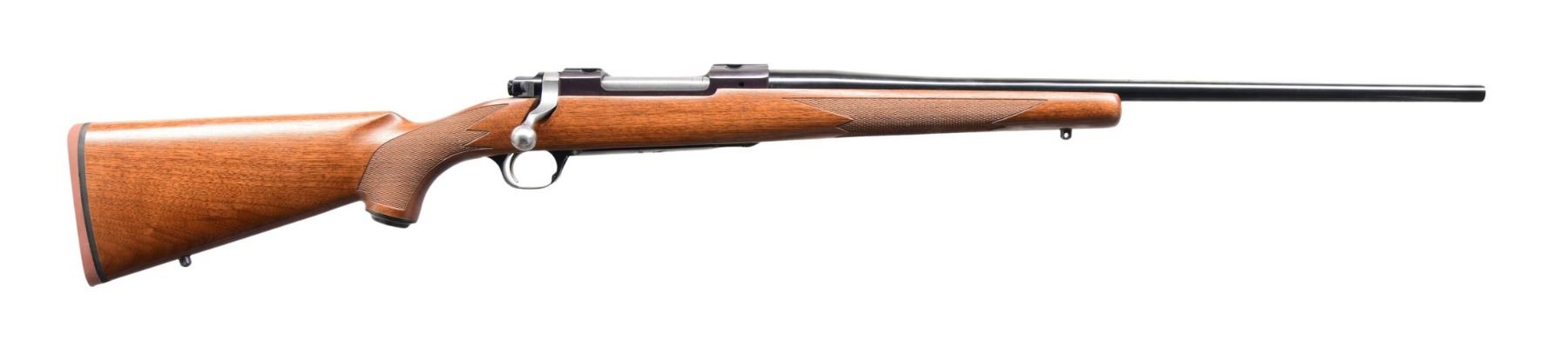 Cal. 280 Rem. S# 711-56415 (2012). Model 37194 with 22" barrel; without sights. Receiver is fitted for rings. Stainless bolt; body is numbered to match. LC9 trigger. Floorplate has engraved Ruger logo. Checkered walnut stock with sling studs, Ruger grip cap, and Ruger red pad. CONDITION: near excellent wood and metal finish, including bore. (24-2853/MD). MODERN. $500-750.