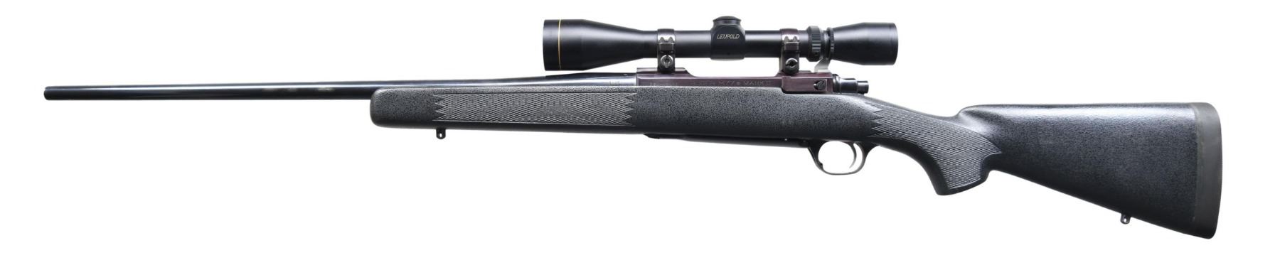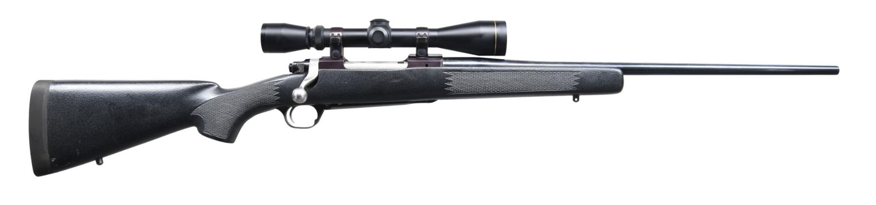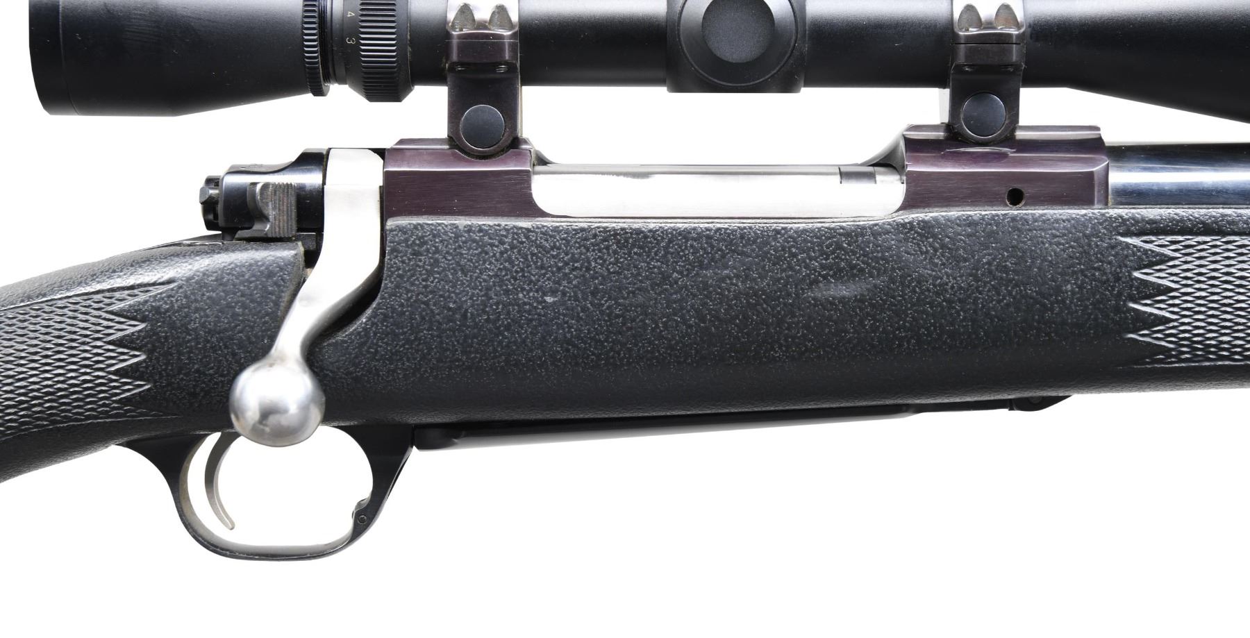 LEUPOLD SCOPE. Cal. 7x57. S# 781-69182 (Mfg. 1993). Tapered 22" barrel without sights. Leupold 3-9x VARI -X IIc scope with duplex reticle on Ruger rings. Replacement black synthetic stock with black pad. CONDITION: Very good blue with areas of worn finish & receiver having a plum tone. Near excellent stock. Bright & shiny bore. Scope has near excellent finish with clear optics. (24-4272/MD). MODERN. $600-900.