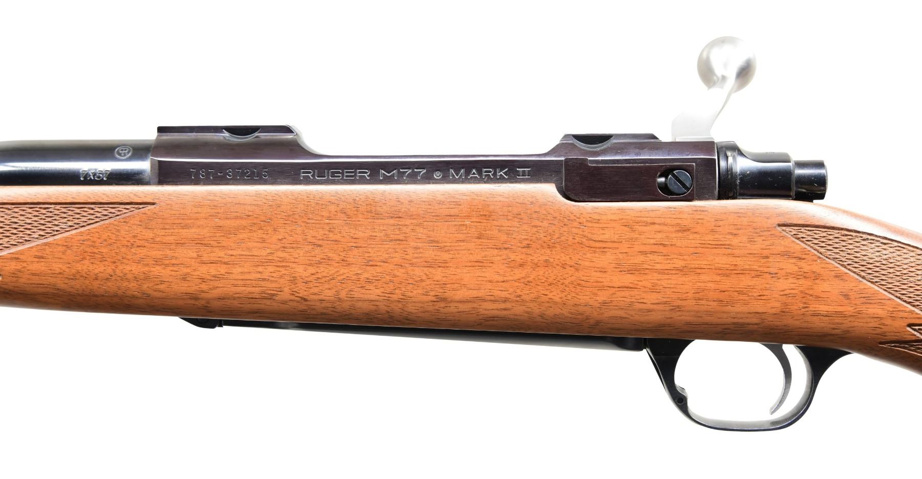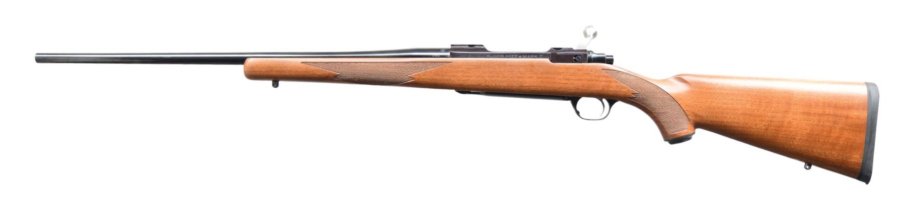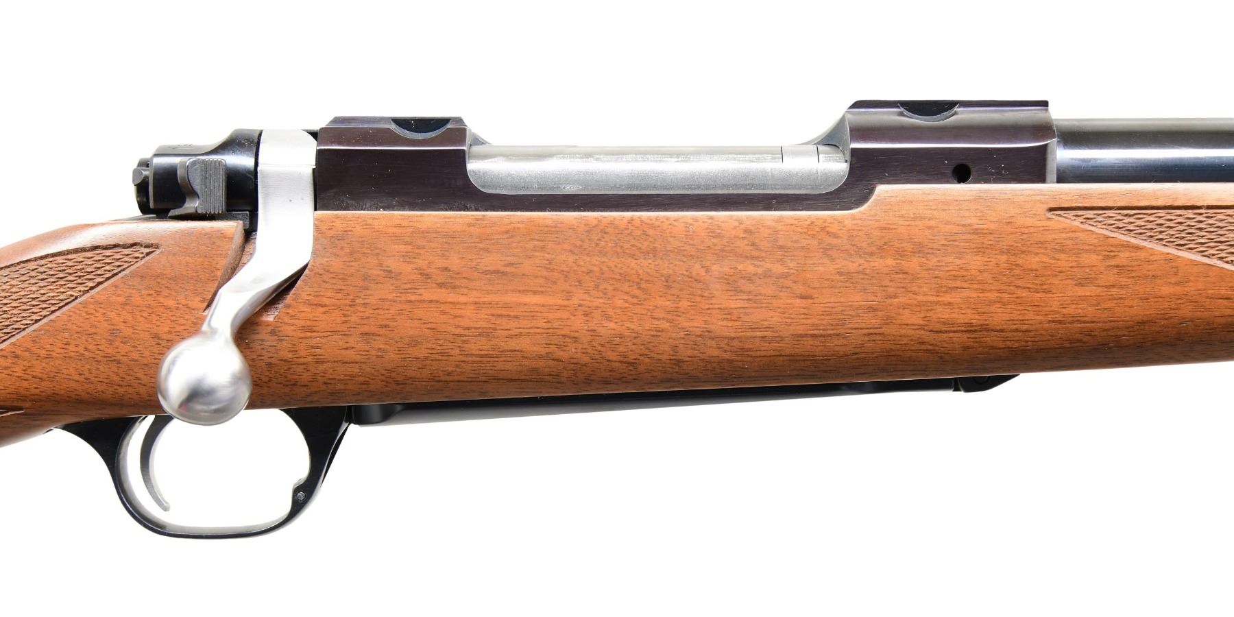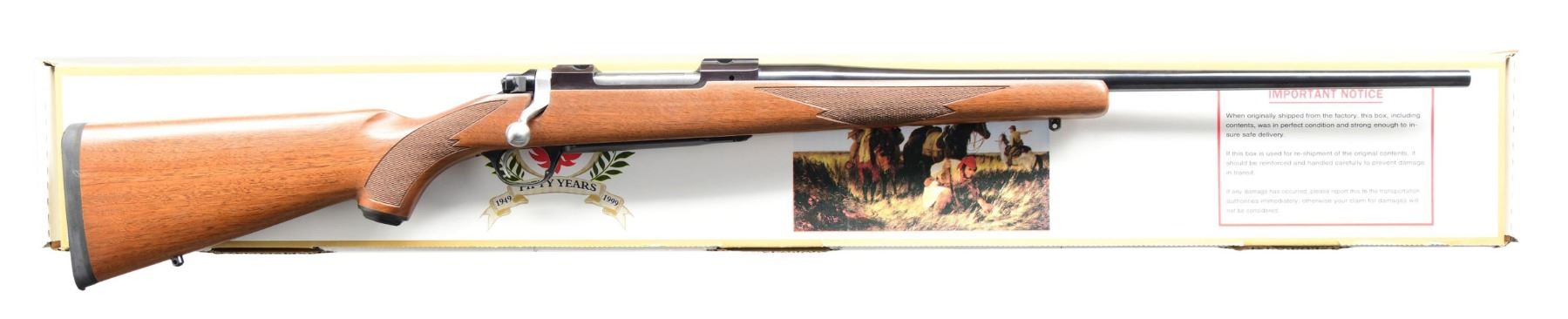 BOX. Cal. 7x57. S# 787-37215 (2000). Model 07896 having a 22" barrel with warning markings; no sights. Receiver is fitted for receiver rings. Checkered walnut stock with sling studs, Ruger grip cap, and Ruger buttpad. UNATTACHED ACCESSORIES: matching-numbered box containing paperwork, lock, and Ruger Medium rings. CONDITION: all aspects are near excellint, including bore. The receiver is acquiring a plum tone. (24-3246/MD). MODERN. $400-600.