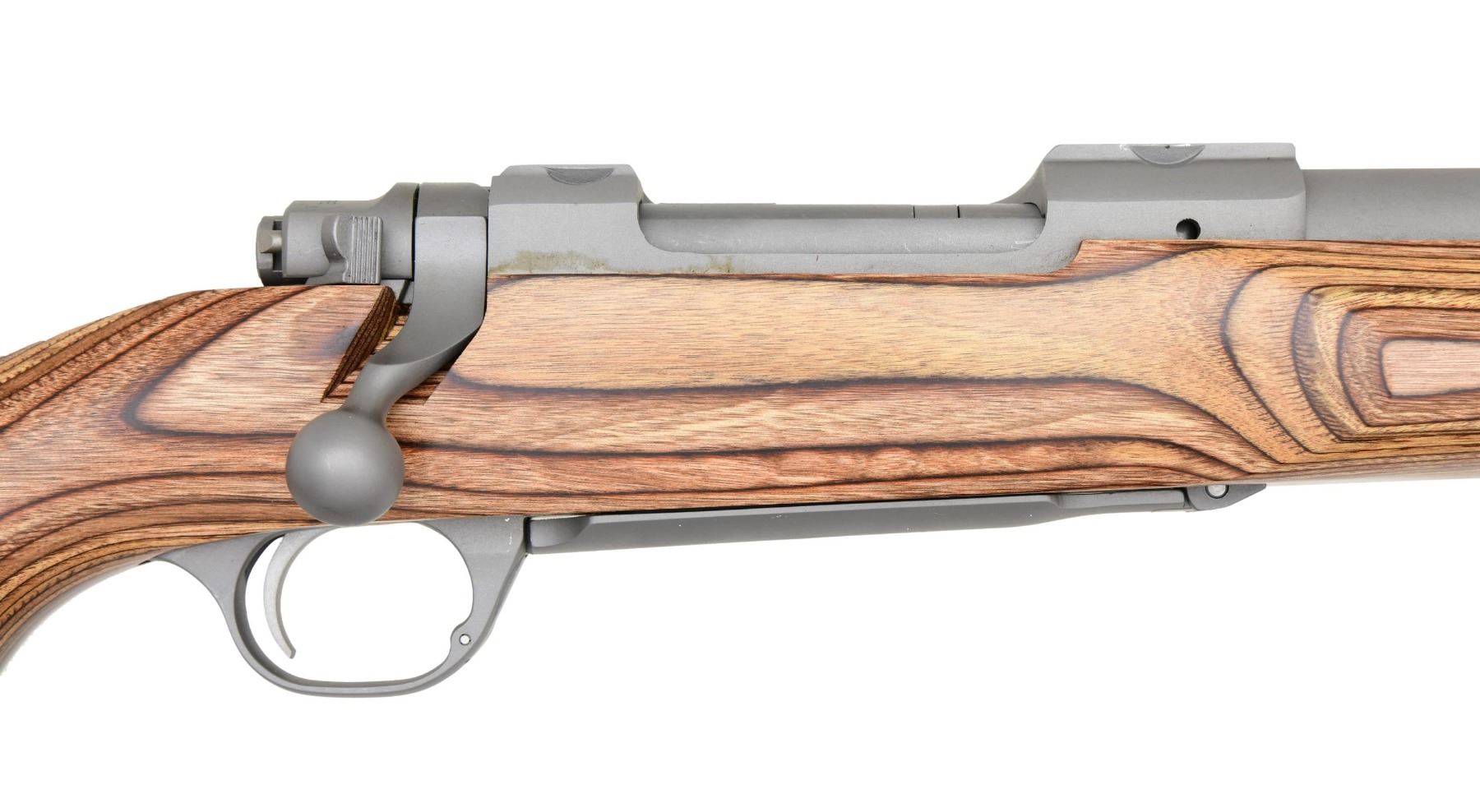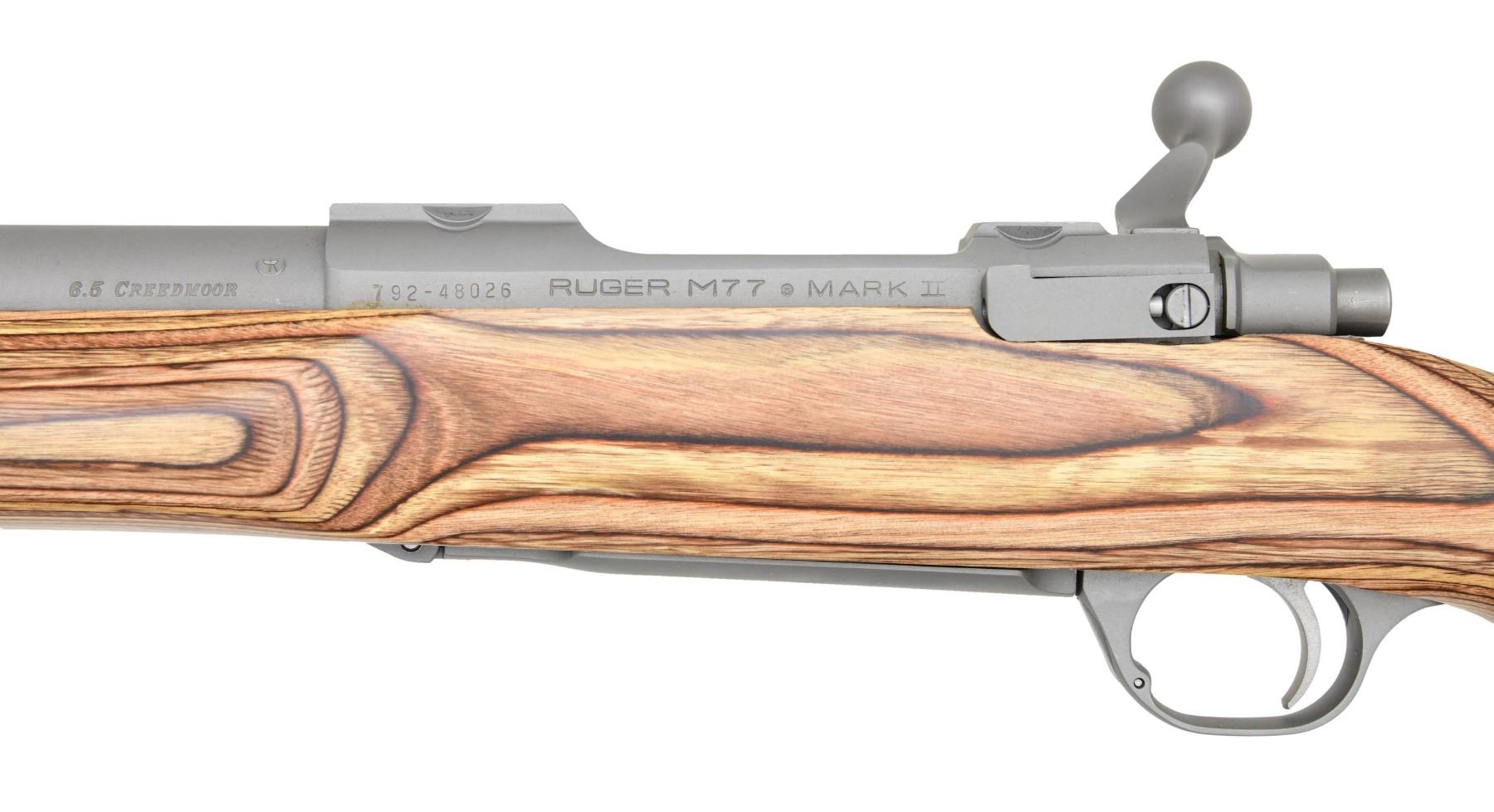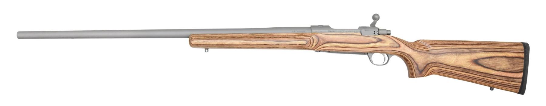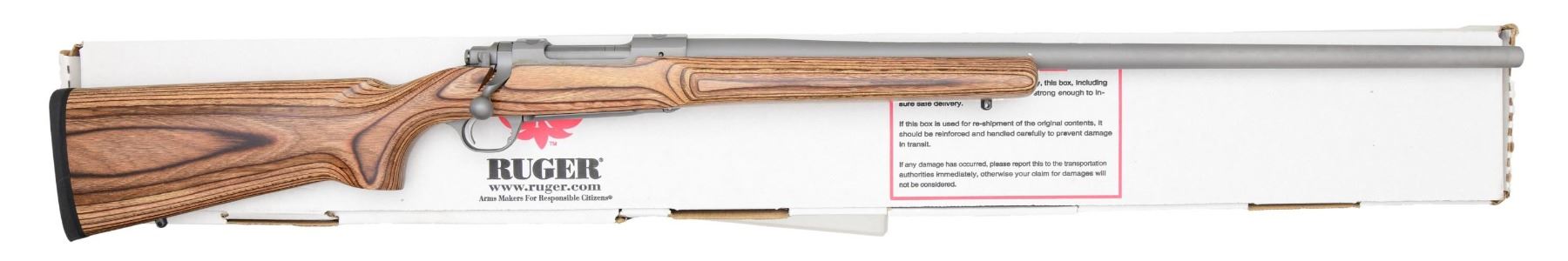 MATCHING NUMBERED MODEL 17973 BOX. Cal. 6.5 Creedmoor. S# 792-48026 (2012). Bbl. 28", without sights; receiver is fitted for rings. Low glare stainless-finished. Light brown, two-tone laminated stock with sling studs and Ruger pad. UNATTACHED ACCESSORIES: matching-numbered box containing packaging to include Ruger rings. CONDITION: all aspects are near excellent, including bore. (24-3583/MD). MODERN. $400-600.