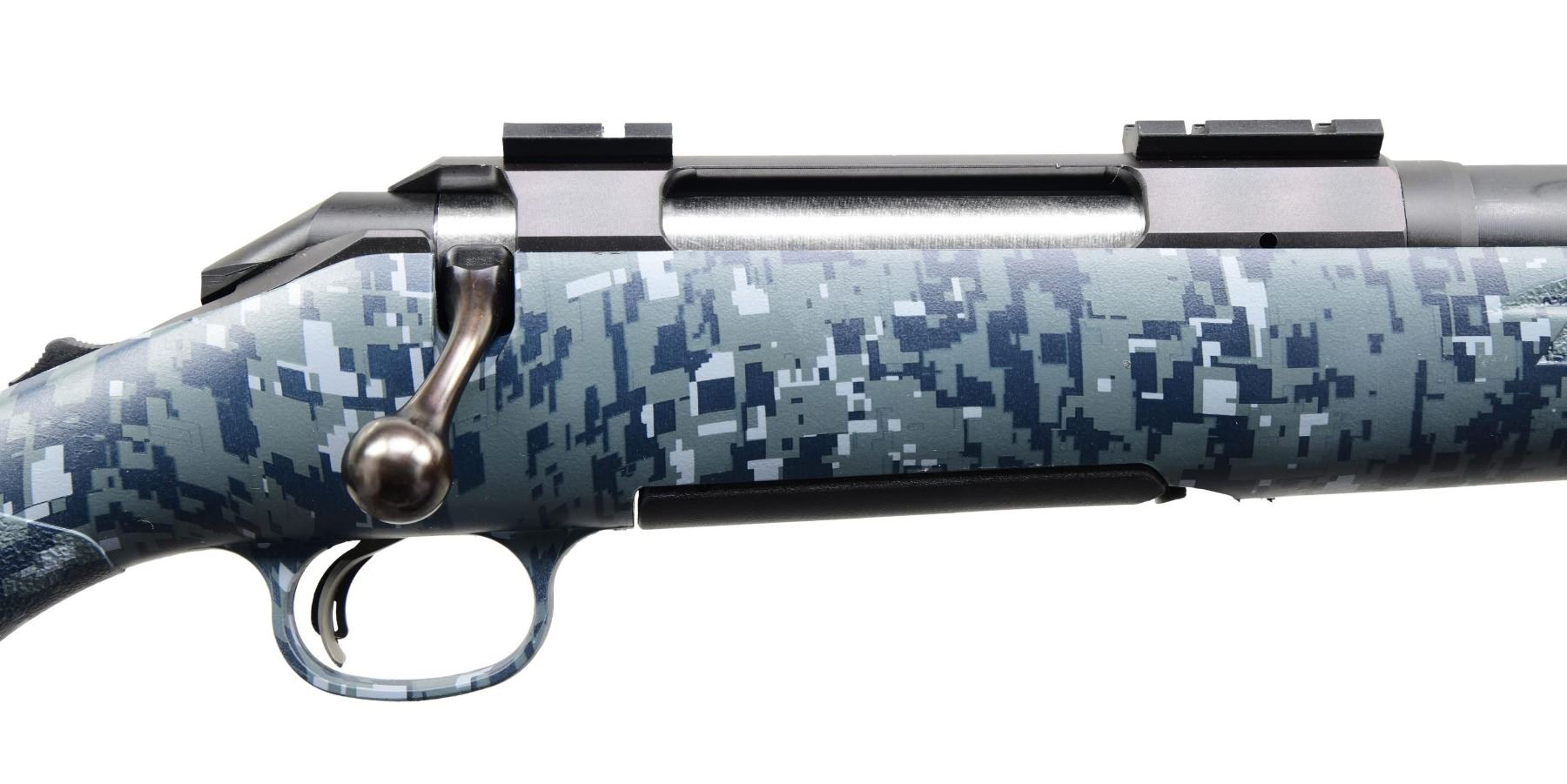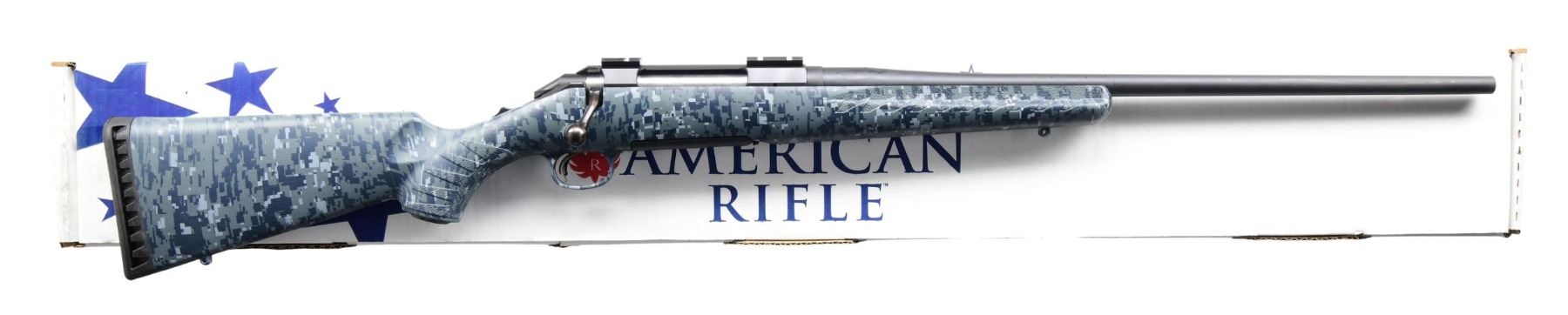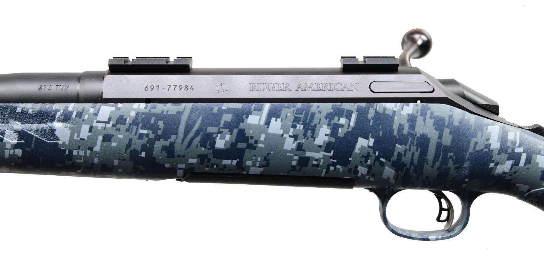 MATCHING BOX. Cal. 270 Win. S# 691-77984 (2013). Model 06910 with 22" barrel, without sights. Two-piece Weaver-style bases on receiver. Adjustable trigger. Navy Blue Digital Camo synthetic stock. MAGS: one 3 rd. UNATTACHED ACCESSORIES: matching box containing paperwork. CONDITION: near excellent overall, including bore. (24-3533/MD). MODERN. $300-400.