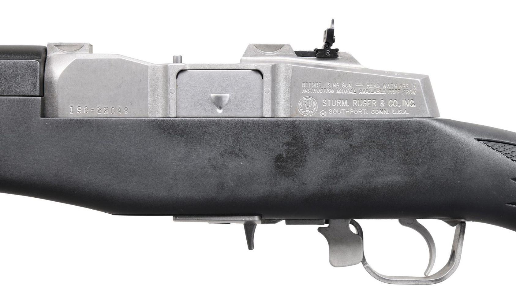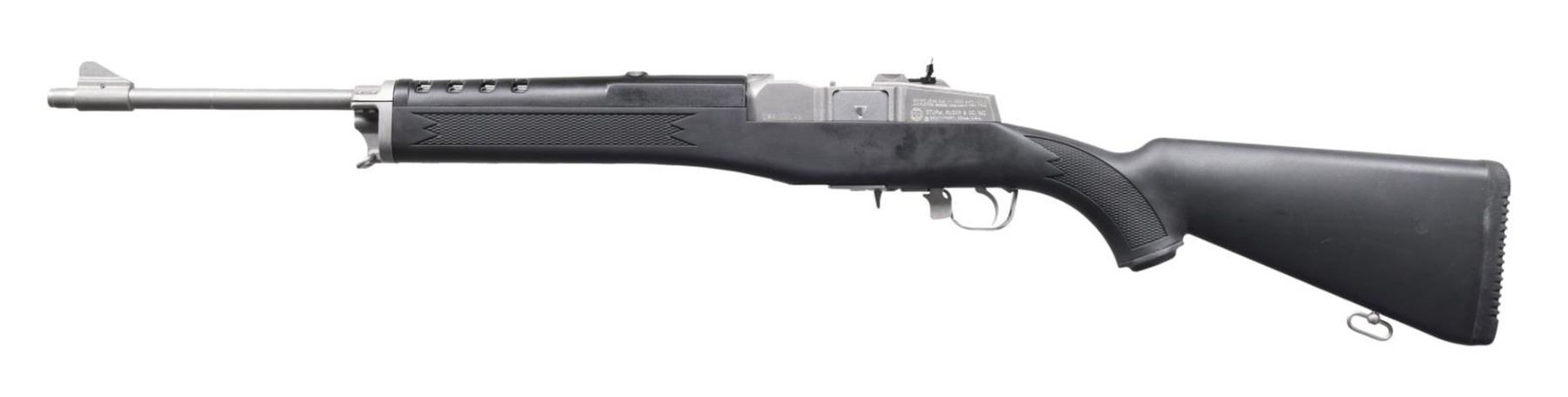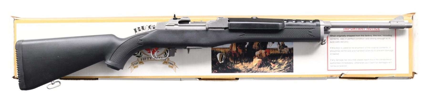 Cal. 223 Rem. S# 196-22049. Bbl. 18 1/2" with serrated blade front sight; peep sight at rear of receiver. Mfg. 2000 (1986 to date) as Model 01865 with Catalog No. KMINI-14/5RP having checkered black synthetic stock, grooved rubber pad, sling swivels and black fiberglass handguard. Receiver machined for Ruger scope rings. MAGS: 1 factory 5 rd. UNATTACHED ACCESSORIES: original 50th anniversary box and packaging to include 1" scope ring set. CONDITION: all aspects near excellent including bore. PROVENANCE: the Lifelong Collection of Terrence McCarty. (24-339/NW). MODERN. $500-750.