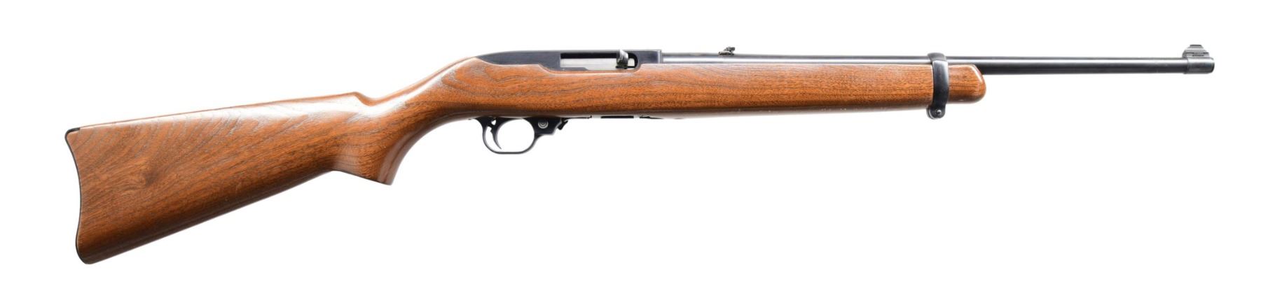 Cal. 22 LR. S# 28206. Bbl. 18 1/2" with banded brass bead front sight and dovetailed folding leaf rear. Mfg. 1965 (1964 to date) as 10/22R having walnut stock with early rear slanting cut forend plus anodized aluminum carbine buttplate; current production has stained hardwood stocks with Celcon plastic buttplates plus "warning marks" starting in 1978. MAGS: 1 factory 10 rd. CONDITION: very good plus overall with near excellent bore. Light handling marks throughout stock set; near excellent buttplate. Very minimal peppery oxidation on barrel and some high edge wear about trigger guard. Faint witness marks on top of receiver from prior scope base installation; plug screws presently installed. (23-6571/NW). CURIO. $300-400.