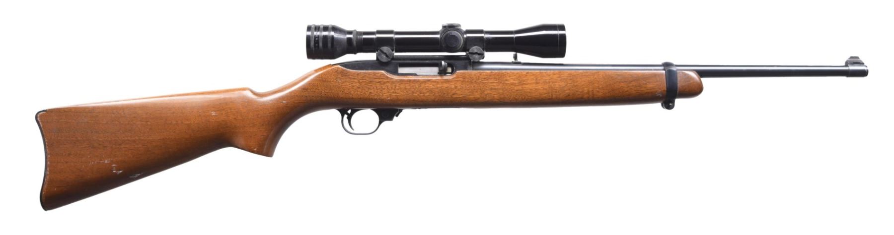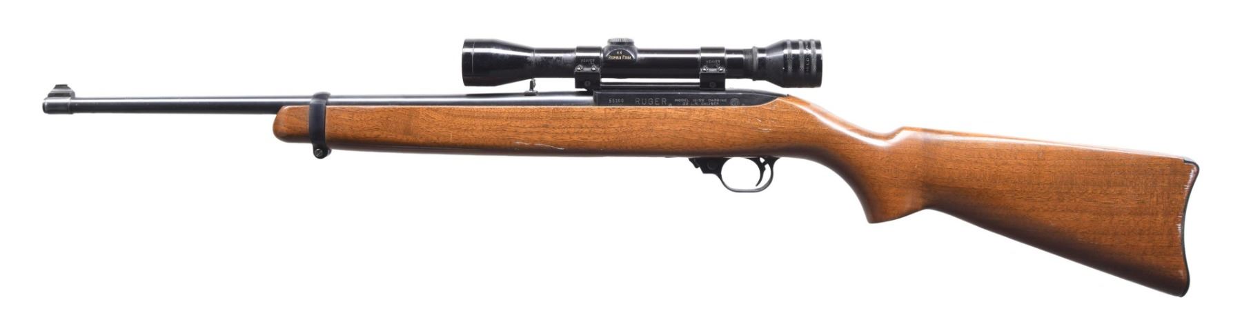 CARBINE. Cal. 22 LR. S# 55300 (1965). Barrel 18.5" with Sturm, Ruger & Co. "Inc." marking. Gold bead front sight & folding rear sight. Drilled & tapped receiver has Redfield 4x Tube scope with crosshairs held on Weaver 1" rings & Weaver base. Barrel band walnut stock with metal carbine buttplate. MAGS: 2 - 10 rd. CONDITION: Very good blue with spots of oxidation on barrel. Good wood finish with numerous marks. Bright bore with strong rifling. Scope has good finish with storage residue & serviceable optics. (24-4197/MD). CURIO. $150-225.