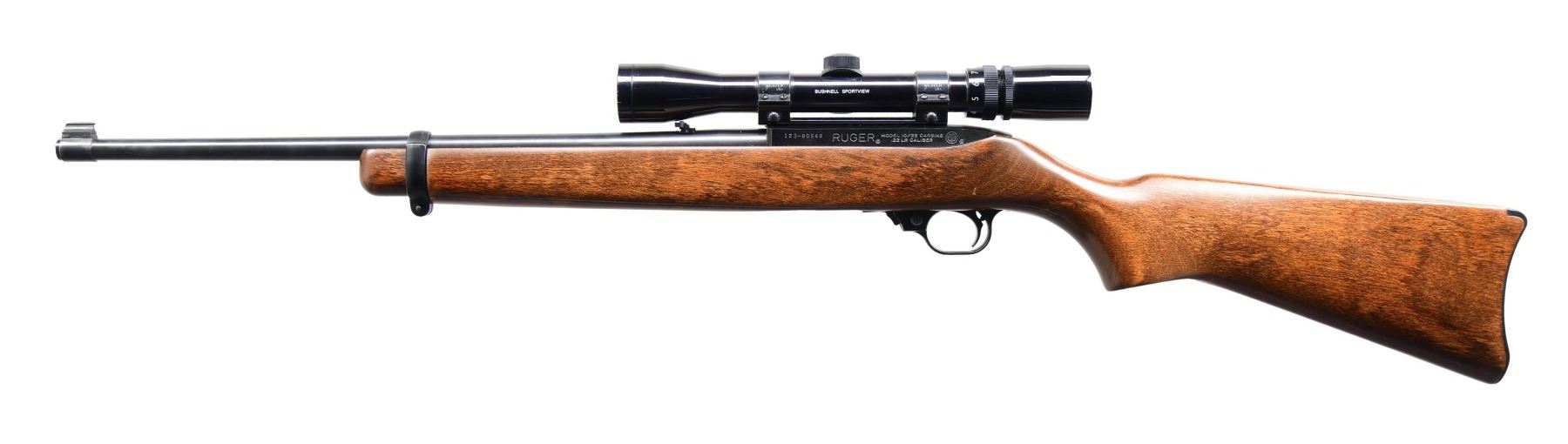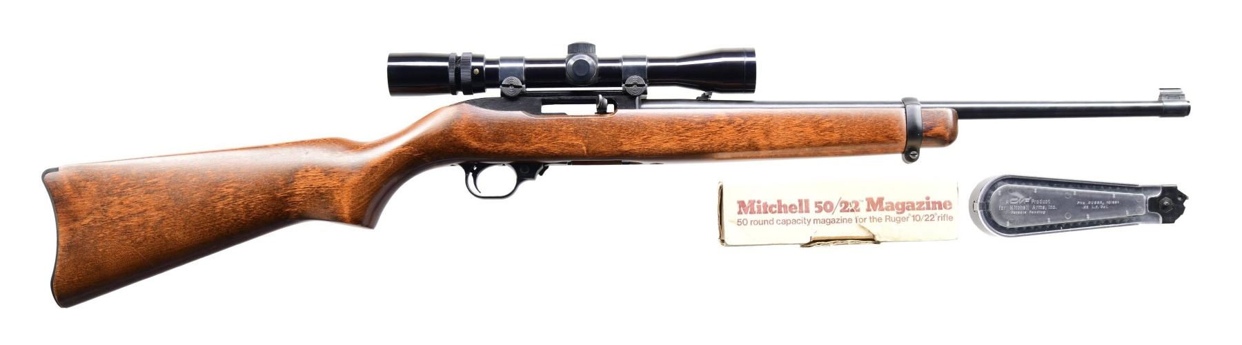 Cal. 22 LR. S# 123-80546. Bbl. 18 1/2". Gold bead front sight. Folding rear sight. Receiver-mounted Bushnell Sportview 3-9x power scope. Scope is stuck on highest power and may require attention to fix. Scope has duplex crosshair reticle with cloudy optics. Blued and black anodized finishes. Birch stock. MAGS: one 50 rd. Mitchell made. CONDITION: stock has an added finish with a small chip behind the receiver, scattered handling marks, and light scratches. Action functions properly when hand-cycled. Metal retains 93% original finishes, with some flaking on the anodized parts and some handling wear. Very good+, bright bore. PROVENANCE: from the lifelong collection of Jim Williams. (24-2724/MJC). MODERN. $200-300.