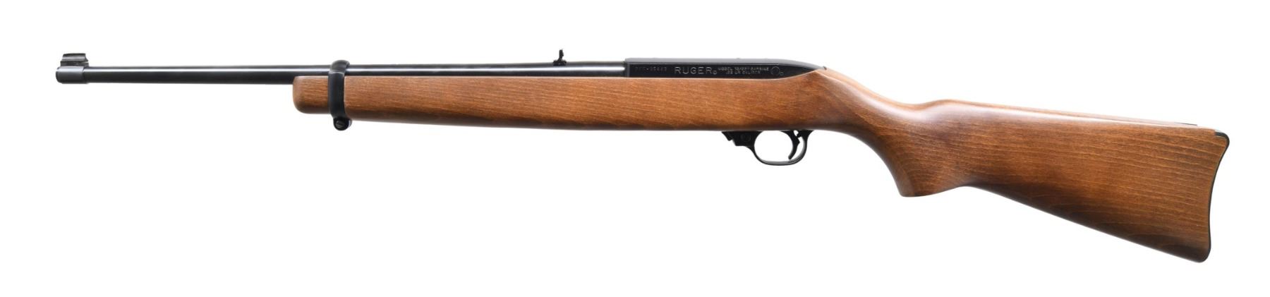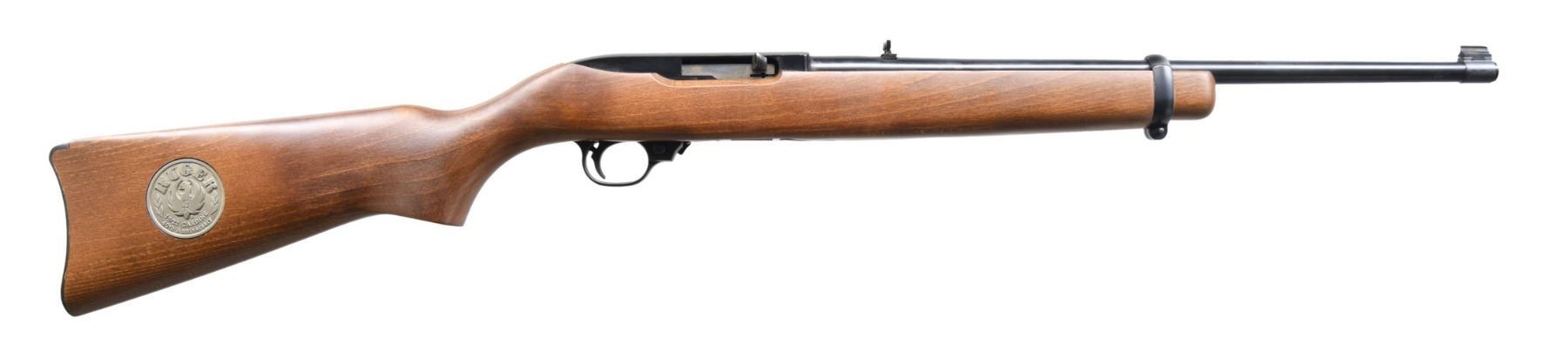 AUTO CARBINE. Cal. 22 LR. S# 255-95443 (mfg. 2004). Commemorating the 40th anniversary of the 10/22 Carbine with medallion on right side of buttstock. Barrel 18.5" with bead front & folding rear sight. Drilled & tapped receiver. Barrel band birch stock with carbine buttplate. MAGS: 1 clear 10 rd. CONDITION: near excellent wood & metal finish with light handling marks. Bright bore with strong rifling. (24-4220/MD). MODERN. $200-300.