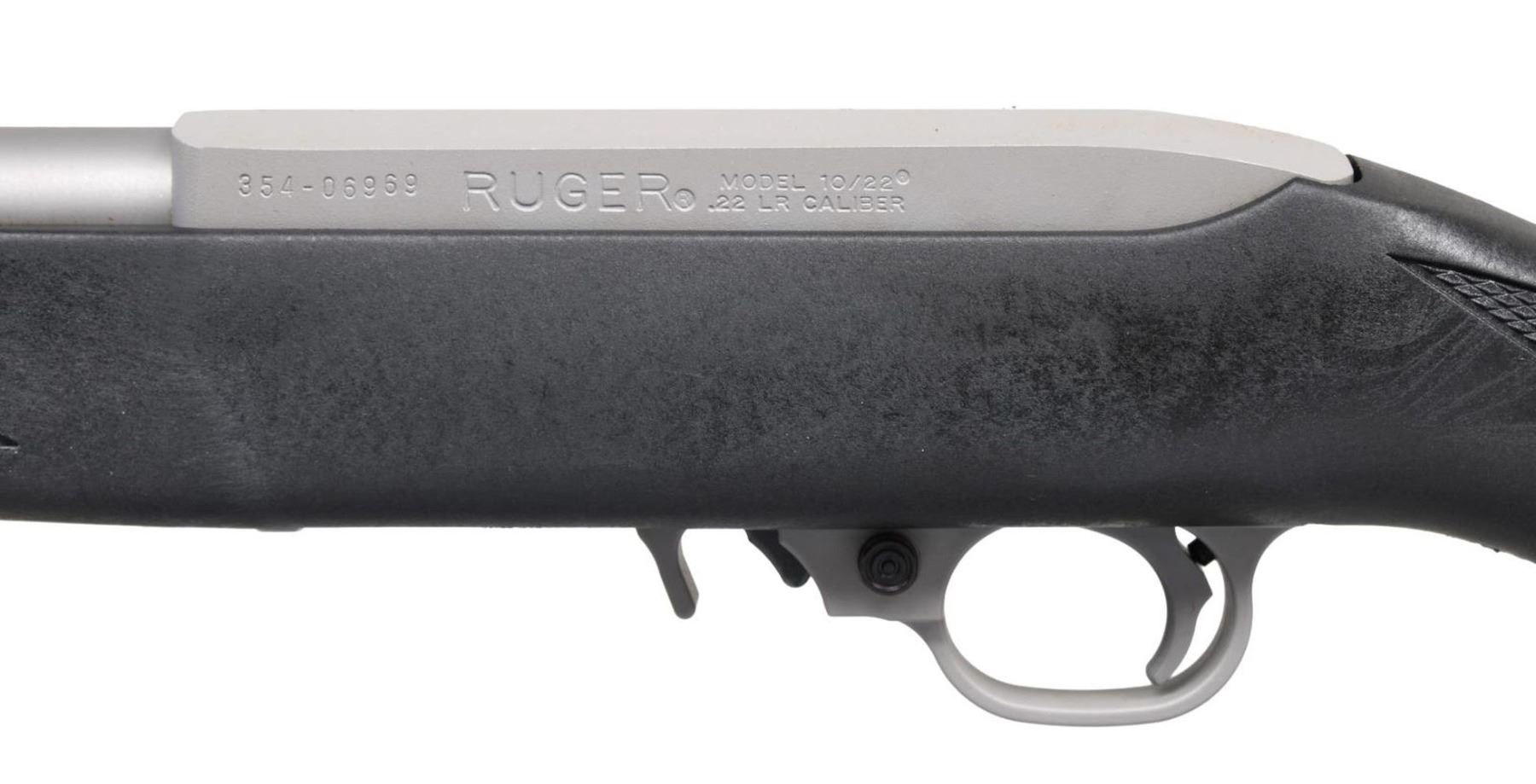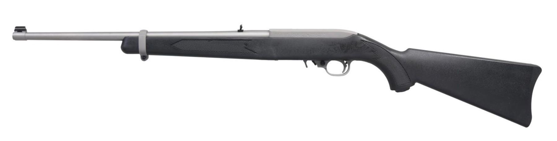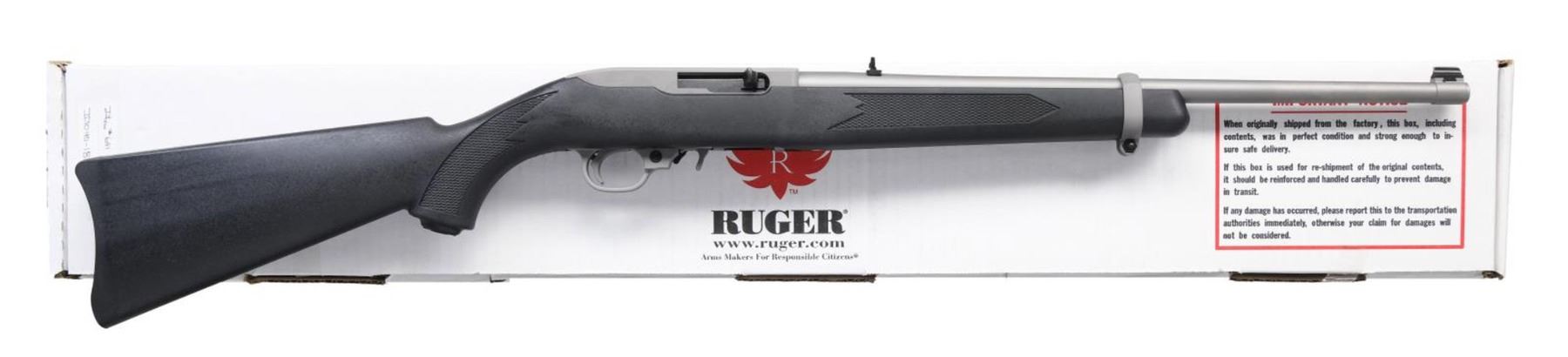 Cal. 22 LR. S# 354-06969. Bbl. 18 1/2" with banded brass bead front sight plus folding leaf rear. Mfg. 2009 (1964 to date for all 10/22's) as matte stainless Model 01140; Catalog No. K10/22RPF. Black checkered synthetic carbine stock with silver barrel band and polymer trigger housing for improved performance; extended magazine release. MAGS: 1 factory 10 rd. UNATTACHED ACCESSORIES: original box and packaging. CONDITION: all aspects near excellent; appears new and unfired. (23-7304/NW). MODERN. $200-300.