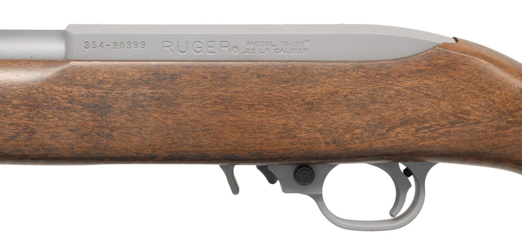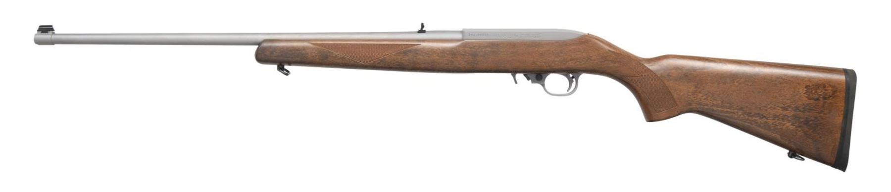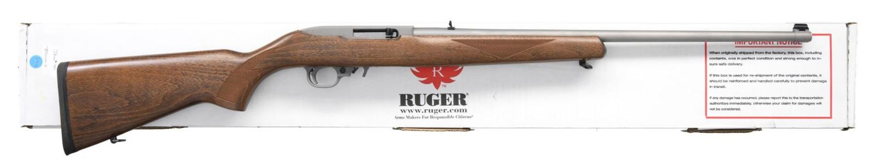 RIFLE. Cal. 22 LR. S# 354-98399. Bbl. 22", hammer forged with banded brass bead front sight, plus folding leaf rear. Mfg. 2009 (1964 to date for all 10/22's) as matte stainless Model 01149; Lipsey's exclusive with Catalog No. K10/22-22. Checkered walnut stained Beech Sporter stock with factory swivels and black rubber butt pad. Silver polymer trigger housing for improved performance, plus extended magazine release. MAGS: 1 factory 10 rd. UNATTACHED ACCESSORIES: original box and packaging. CONDITION: all aspects near excellent; appears new and unfired. (23-7307/NW). MODERN. $250-350.