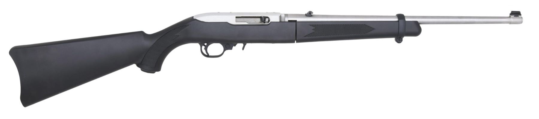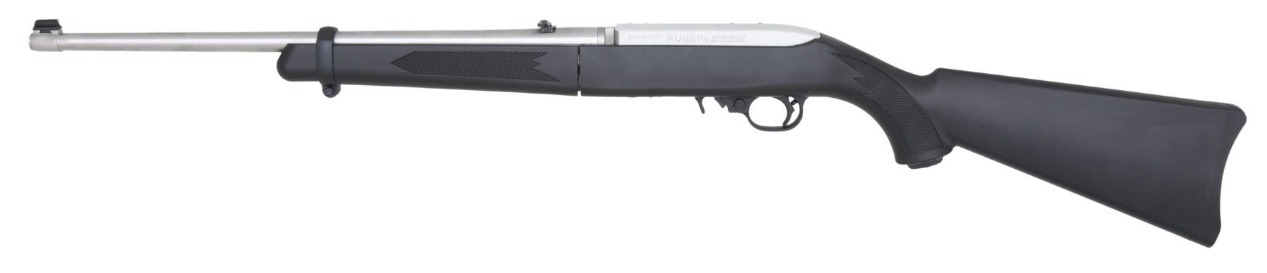 Cal. 22 LR. S# 359-97900 (2012). Barrel. 18.5". Bead front & folding rear sight. Stainless finish. Black synthetic stock set. MAGS: 1 -10 rd. UNATTACHED ACCESSORIES: Matching numbered box containing Ruger carry case containing paperwork, sling, lock & optic rail. CONDITION: all aspects near excellent. (24-5011/MD). MODERN. $200-300.