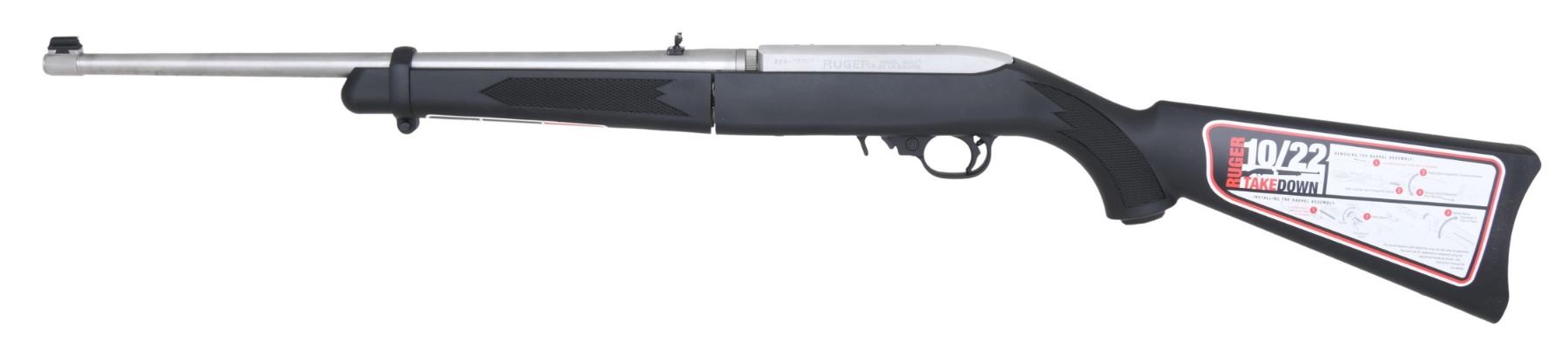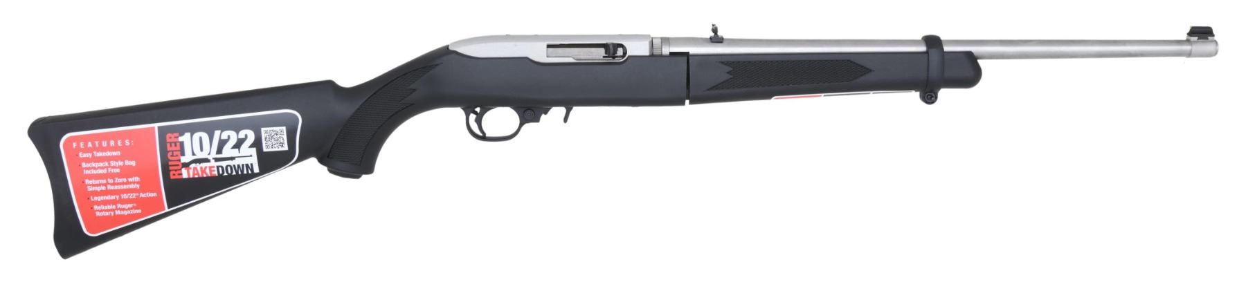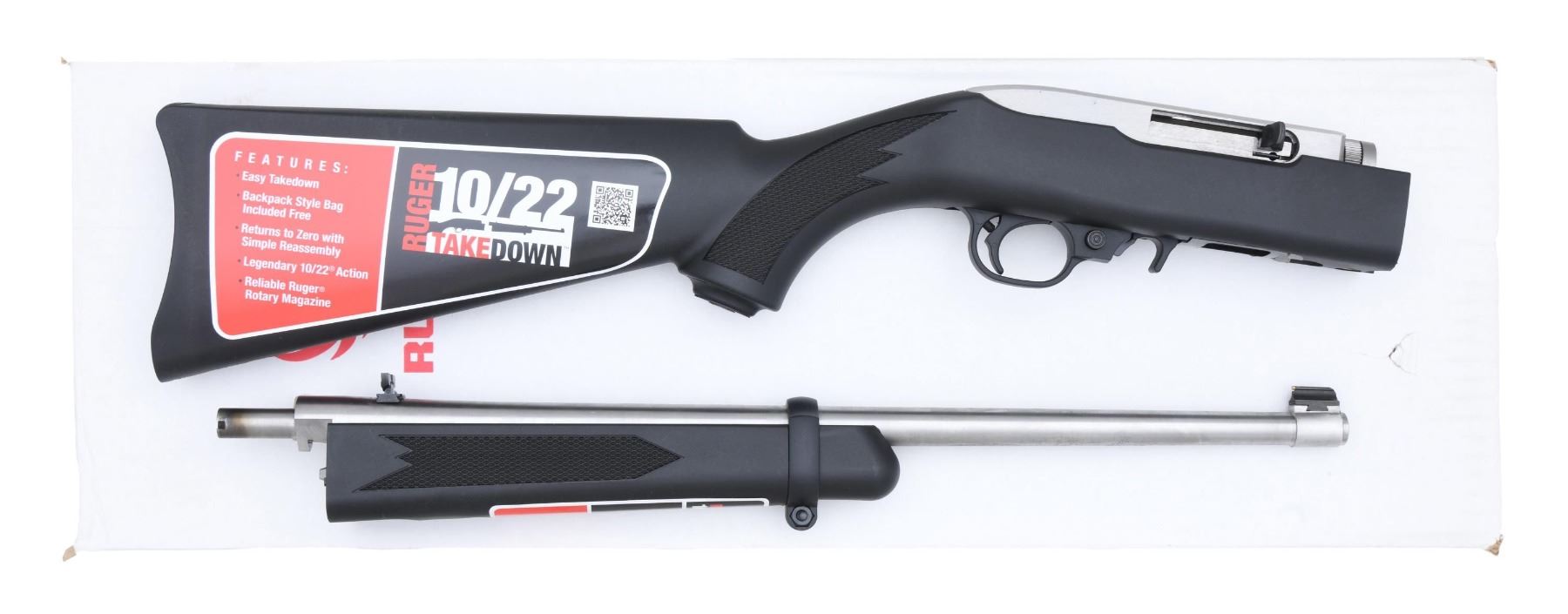 Cal. 22 LR. S# 820-63163. Bbl. 18 1/2". Gold bead front sight. Folding rear sight. Receiver is factory drilled & tapped for scope mounting. Takedown model of the 10/22 rifle that comes apart in the center. Stainless finish. Black synthetic pistol grip stock. MAGS: 1-10 rd. UNATTACHED ACCESSORIES: matching numbered factory box w/ carrying case, manual, sling & cable lock. CONDITION: all aspects near excellent. (23-6757/MJC). MODERN. $200-400.