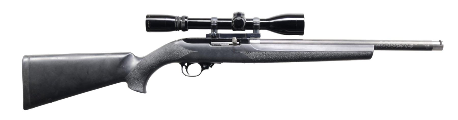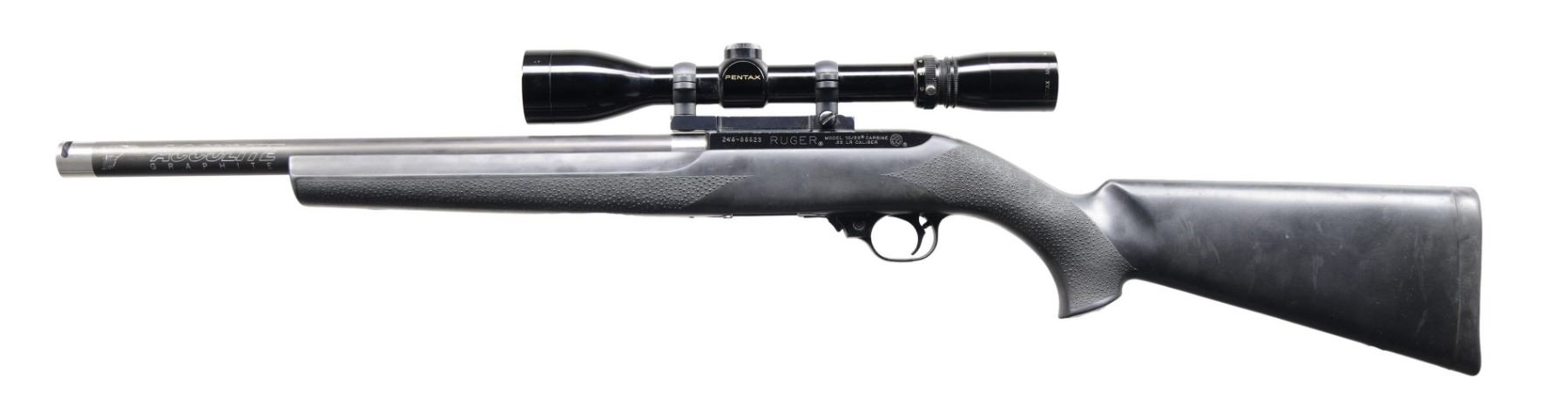 Cal. 22 LR. S# 246-56623. Bbl. 16 3/4" Acculite Graphite. Rifle is equipped w/ a Pentax 3-9x power scope. Scope has duplex crosshair reticle & very good optics. Modified 10/22 w/ aftermarket bull bbl. & bolt. Bolt marked "MATCH" & has extended charging handle. Bbl. has gray finish. Other parts have matte black finish. Hogue Black synthetic stock w/ holes for sling studs. MAGS: none present. CONDITION: stock shows scattered handling marks. Metal shows some flaking black finish & handling wear. Action functions properly when hand cycled. Very good bore. (23-6305/MJC). MODERN. $300-400.