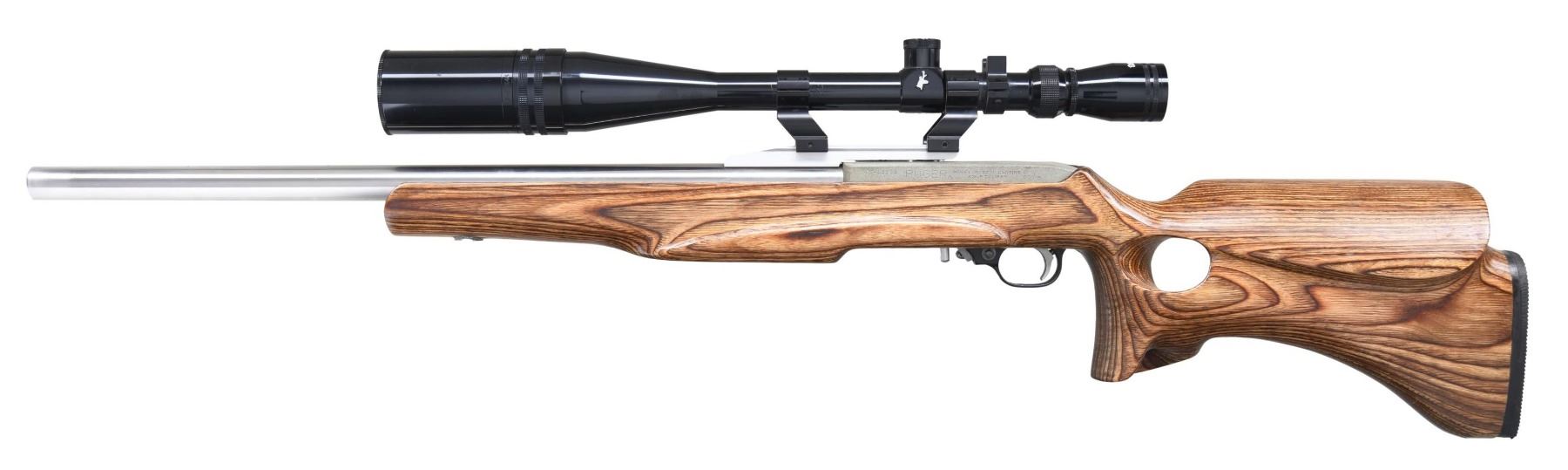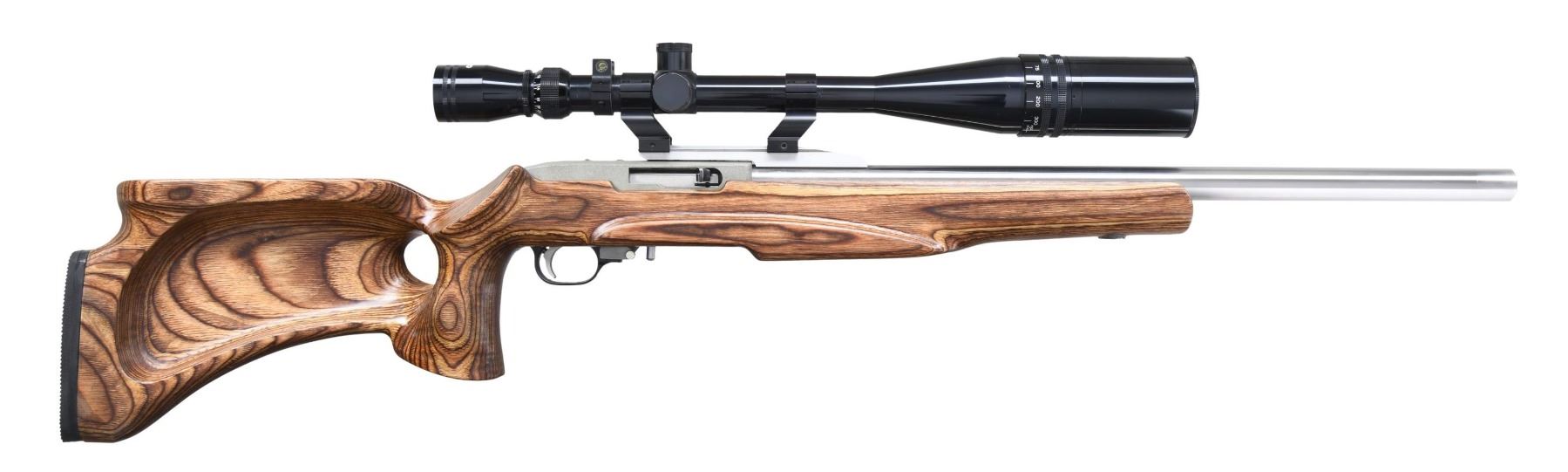 Cal. 22 LR. S# 245-13738. Bbl. 21 5/8" polished stainless (.920" diameter) unmarked replacement target barrel with recessed crown plus natural aluminum cantilevered scope base at rear. Mfg. 1996 originally as Model 01121 Target Model having black receiver and blued 20" barrel. Present stock (unknown maker) similar in appearance to Boyd's Blaster model; thumbhole design with cheekpiece, added tension adjustment in forend (balance of barrel full floating), Pachmayr grooved black rubber pad, fully glass bedded action plus flares at pistol grip and toe of buttstock. Receiver has been sandblasted with present finish of light green tone. Black anodized trigger housing updated with pull back bolt release, rotating safety, stainless pivot pins, bow slotted to allow Allen wrench trigger adjustment, magazine release extension plus rear drilled and tapped for overtravel adjustment. Scope rings of Kwik-Site style holding Tasco World Class gloss finished 8-32X44 target scope having sun shade, screw on lens cap for its adjustable objective, fine crosswire with dot reticle, capped target knobs and added spirit level. MAGS: 1 factory 10 rd. CONDITION: Very good appearance overall with receiver finish somewhat lacking in quality. Traces of bedding compound showing by front of magazine well. Bottom of forend flare has two small holes that likely were for bench rest plastic slider. Barrel tensioner has traces of bedding compound and hobbiest workmanship (slight protrusions; not flush or recessed). Very slight scuffs around barrel near muzzle. Very good to excellent stock finish. Near excellent bore and scope set (crystal clear optics). (24-5159/NW). MODERN. $300-450.