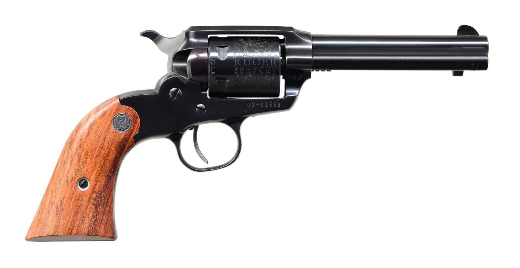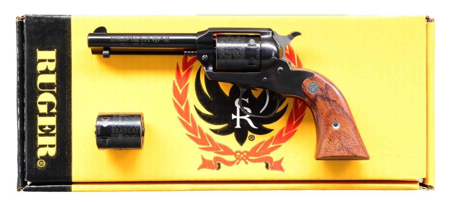 Cal. 22 LR / 22 Mag. S# 93-01552. Bbl. 4" with blade front sight plus frame notched rear. Mfg. 1993 (1993 to date for all New Bearcats) as Model 00912 Convertible with catalogue number of SBC4. Blued steel frame including trigger guard; black alloy ejector housing. Smooth Rosewood grips with small silver eagle medallions (black backgrounds). Wide spur hammer of Super Blackhawk style. ".22 CAL." on barrel having eagle logo and Southport address; frame unmarked except for serial number. Of approximately 1,000 Convertibles made, only about 700 exist as Ruger announced a recall in which they kept the Magnum cylinders of those sent to the factory (301 by 1 reference) and refunded $40. There was reported to be a problem with timing of the Magnum cylinder that could cause case heads to rupture posing danger to users and bystanders. Original Bearcat loading gate with plum hue and no positioning tab at top. UNATTACHED ACCESSORIES: original yellow / black 1 piece box (plus shipping sleeve with remnant of UPS label) with packaging to include auxiliary 22 Magnum cylinder, recall notice and Nov. 20, 2006 factory letter from Robert Wood (Product Service Manager) to Stoneagle (gun shop only 1/2 mile from Newport factory) advising him to return the Magnum cylinder; no manual (regular New Bearcat manuals available free from Ruger). CONDITION: all aspects near excellent appearing new and unfired. (23-6653/NW). MODERN. $1,250-1,750.
