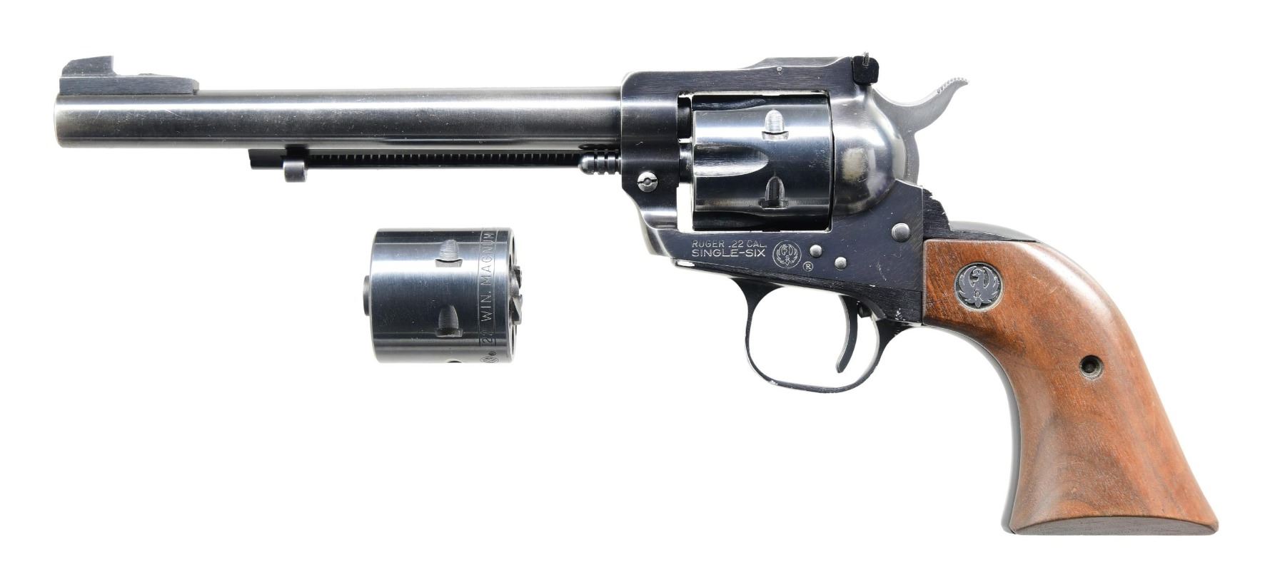 Cal. 22 LR/22 Mag. S# 60-96514. Bbl. 6 1/2". Blade front sight. Adjustable square notch rear sight. Mfg. 1972. Revolver does not have safety upgrades such as transfer bar. Blued finish w/ black anodized trigger guard & grip frame. Smooth walnut grips w/ silver Ruger medallions. UNATTACHED ACCESSORIES: 22 Mag cyl. that has hard to read electropencil number that does not appear to match frame. CONDITION: grips show scattered light handling marks. Metal retains 90% original blue w/ scattered edge wear, some light oxidation & fading. Action functions properly when hand cycled. Very good plus bore. (23-6241/MJC). CURIO. $300-500.