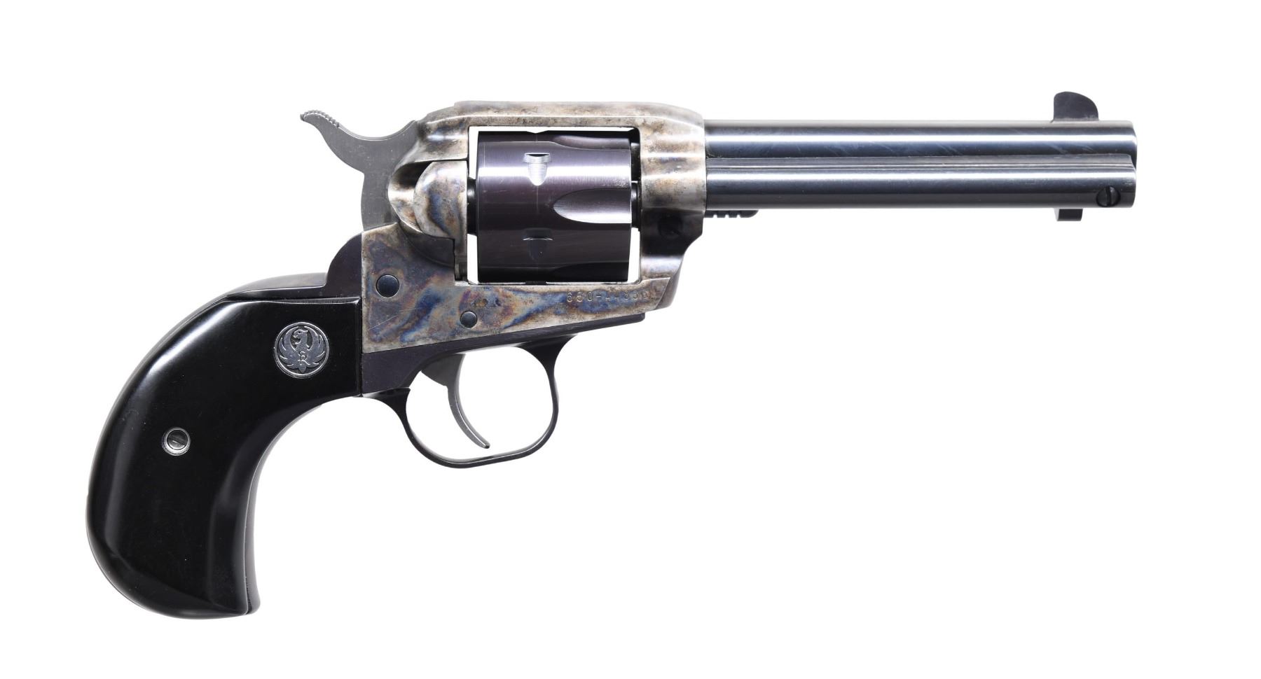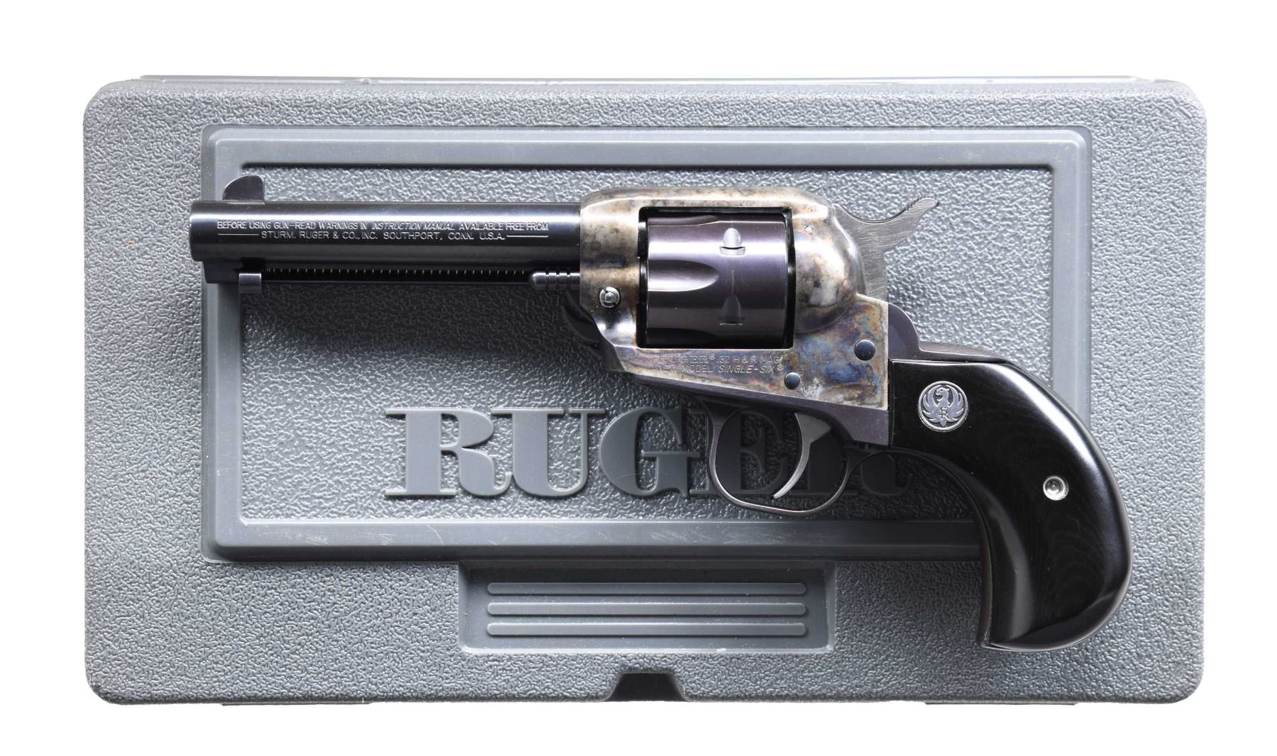 Cal. 32 H&R Mag. S# 650-44836. Bbl. 4 5/8". Blade front sight. Fixed rear sight. Case-colored frame. Balance of other parts appears blued. Catalog number SSMBH-4F and model number 06514. Smooth black synthetic birdshead grips with silver Ruger medallions. UNATTACHED ACCESSORIES: matching-numbered factory hardcase with manual and trigger lock. CONDITION: grips show light handling wear. Metal retains 95% original finishes with a few handling marks and a drag line and edge wear on cyl. Action functions properly when hand-cycled. Very good+ bore. (24-4027/MJC). MODERN. $400-600.