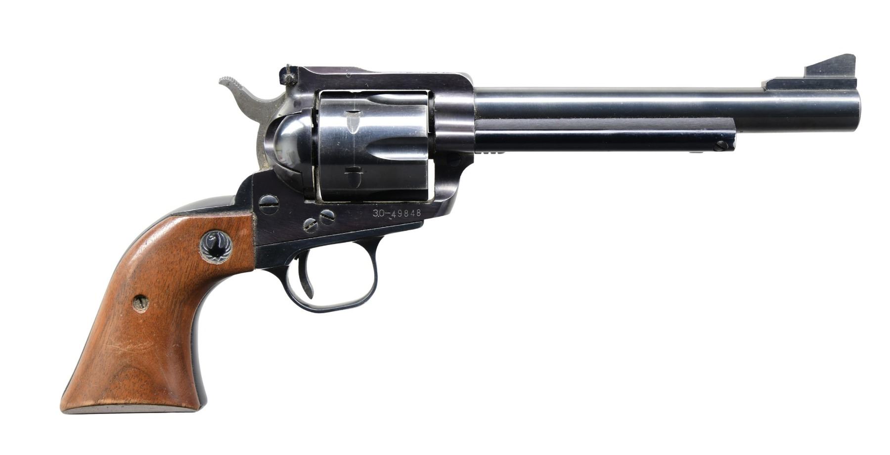 Cal. 357 Mag. S# 30-49848 (1970). Bbl. 6.5". Blade front sight and adjustable rear sight. Six-shot fluted cylinder. Two-piece walnut grips with black eagle medallions. CONDITION: good to very good metal finish, with occasional spots of oxidation with areas of wear and marks. Very good grips with wear and marks near the butt. Very good bore. (24-3915/MD). CURIO. $300-400.