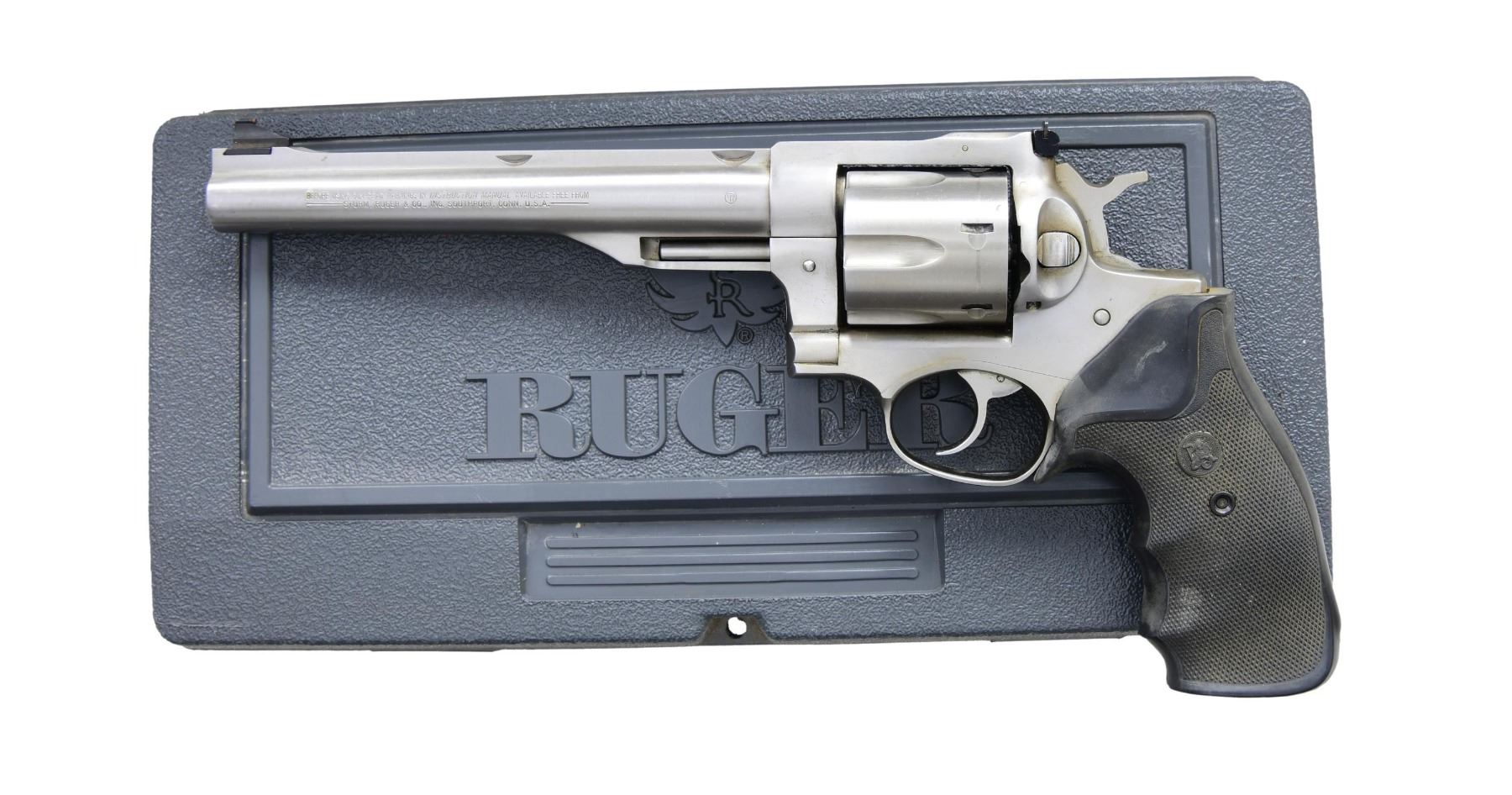 MATCHING FACTORY MODEL 5024 BOX. CAL. 45 Colt S# 503-25596 (1998). Satin stainless finish. Barrel length 7 1/2". Front sight is a bead with an adjustable rear sight. The cylinder holds six rounds and is fluted. Grips are replacement Pachmayr black rubber with a checkered texture. UNATTACHED ACCESSORIES: factory box with paperwork and Ruger rings; paperwork shows evidence of water damage; part of the label is ripped off. CONDITION: overall condition is near excellent, with approximately 95% of the original finish remaining on the barrel. The frame retains about 95% of its finish. Grips show minor handling wear but remain in excellent condition. The bore is bright with sharp rifling. (24-4446/MD). MODERN. $450-650.