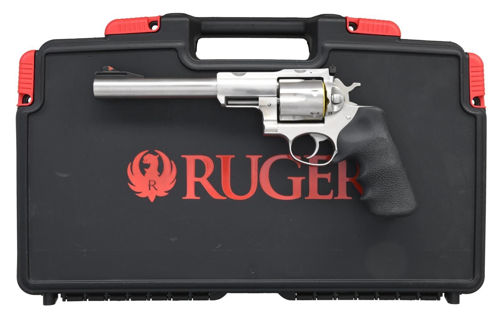 Cal. 44 Mag. S# 553-08121. Bbl. 7 1/2" bull with 11 degree target crown, red insert ramped sight blade securely attached with 3 screws, factory milled for Ruger scope rings on cylinder frame having factory white outlined adjustable rear sight. Mfg. 2022 as Model 05501 (KSRH-7) with Hogue finger grooved Tamer Monogrip of pebble grained rubber having Ruger logo. Extremely robust revolver expressly designed for scoped use. Triple locking cylinder and extended cylinder frame; both features enhance its durability to handle powerful big game loads. UNATTACHED ACCESSORIES: factory black plastic case and packaging to include set of Ruger scope rings. CONDITION: all aspects near excellent with new, unfired appearance. (23-3849/NW). MODERN. $700-950.