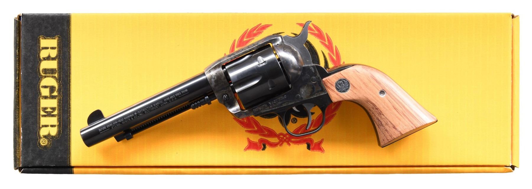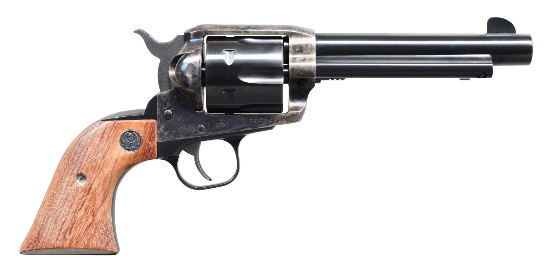 WITH FACTORY BOX Cal. 44-40 S# 55-53499. Ruger New Model Vaquero revolver with blue and case-hardened finish. Produced from 1993 to present with over 500,000 manufactured. Features a 5.5" barrel, fixed rear sight, and blade front sight. Single action trigger and hammer, with a fluted six-round cylinder. Smooth walnut grips with Ruger medallion inlays. MAGS: none. UNATTACHED ACCESSORIES: factory box and papers. CONDITION: Excellent overall condition. Barrel retains approximately 98% of its original finish, with the frame also retaining about 98% finish. Grips are in excellent condition, showing minimal wear. Bore is bright with sharp rifling. MODERN (23-6623) $400-600.