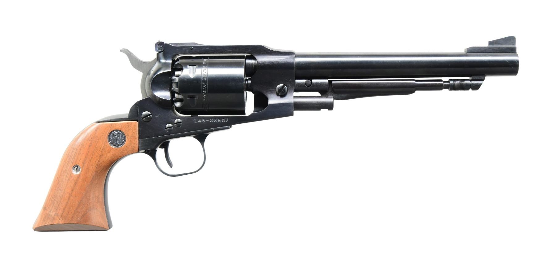 Cal. 44. S# 145-38507. Bbl. 7 1/2". Ramped, serrated blade front sight. Adjustable square notch rear sight. Mfg. 1982. Blued finish. Smooth hardwood grips with silver Ruger medallions. UNATTACHED ACCESSORIES: unlabeled yellow and black Ruger box with manual and paperwork. CONDITION: grips and metal show a few handling marks. Action functions properly when hand-cycled. Bright, very good+ bore. (01-25497/MJC). ANTIQUE. $500-750.