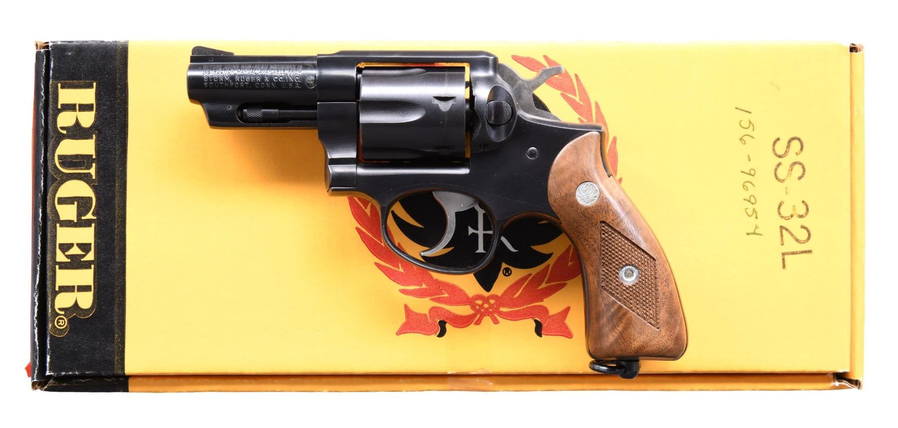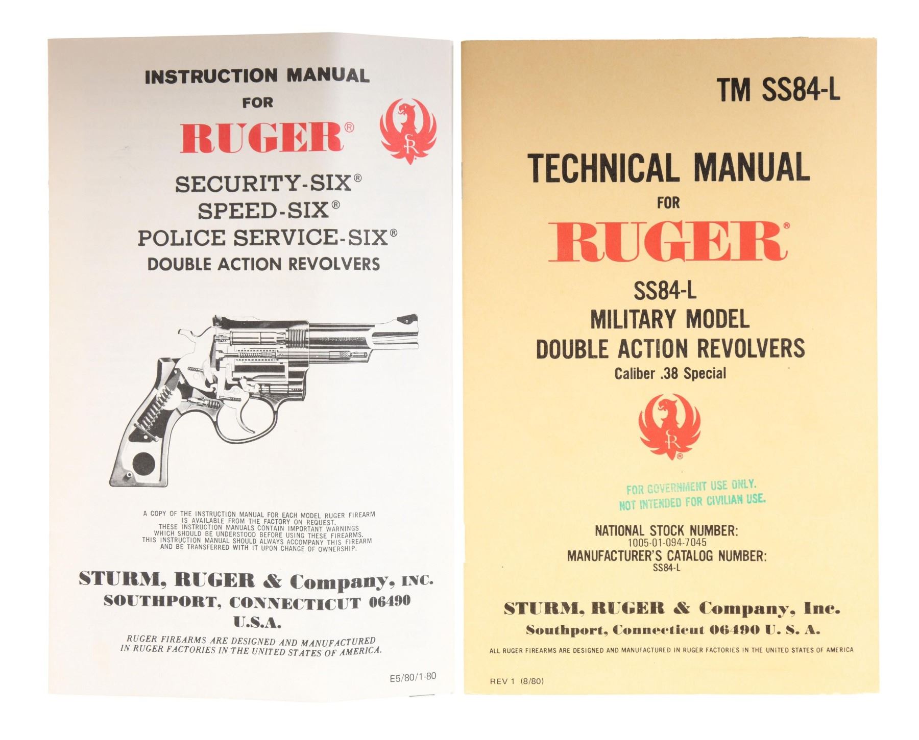 REVOLVER WITH LANYARD SWIVEL. Cal. 357 Mag. S# 156-96954. Bbl. 2 3/4" with "warning marks", protected ejector rod and grooved rib having pinned serrated blade sight; frame notched rear sight. Mfg. 1981 for military sales; SS84-L most often encountered in 38 Spl. with 4" barrel. Only reference to SS32L is S# 157-01486 in RENE Reference Guide having "U.S." markings; only 1 known. No reference to this model having round butt with lanyard loop and without "U.S." markings. Walnut grips with high back backstrap and small silver medallions; stainless hammer and stainless smooth faced trigger. UNATTACHED ACCESSORIES: original box without "L" after model designation plus shipping sleeve with "L" added in blue ink within red stamped model info. Additional cardboard box to enclose the shipping sleeve and spit on the top at middle like for earliest Ruger SA revolvers; black markered S# and black stamped model designation. Two manuals: 1-80 dated for multiple examples of Speed and Security-Six revolvers plus military manual for SS84-L dated 8-80. Military style foil wrap with black stamped model and markered S#. CONDITION: all aspects near excellent appearing new and unfired. (24-2904/NW). MODERN. $500-750.