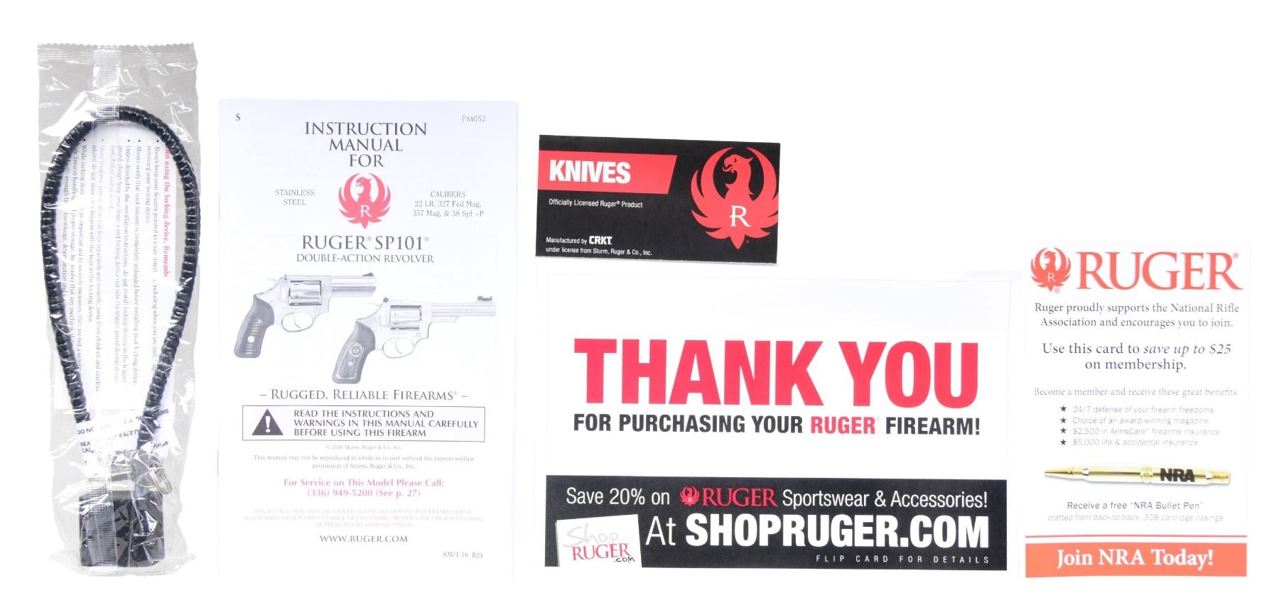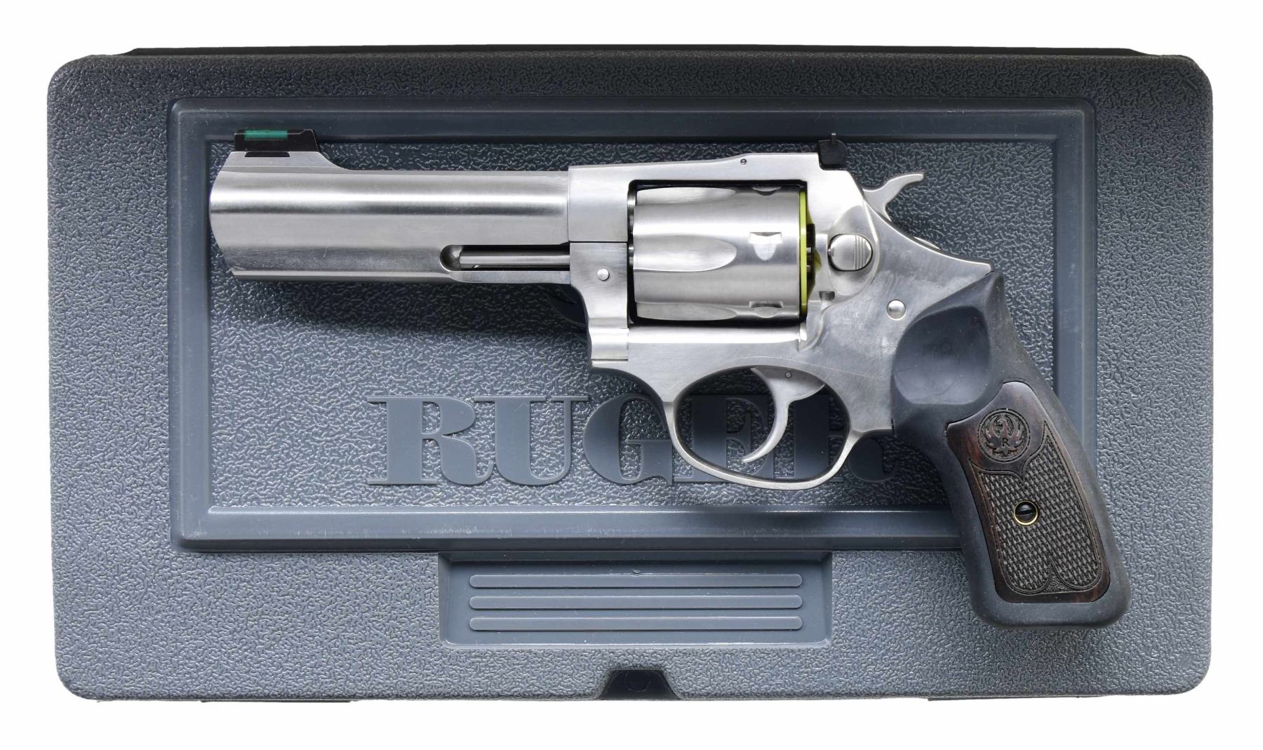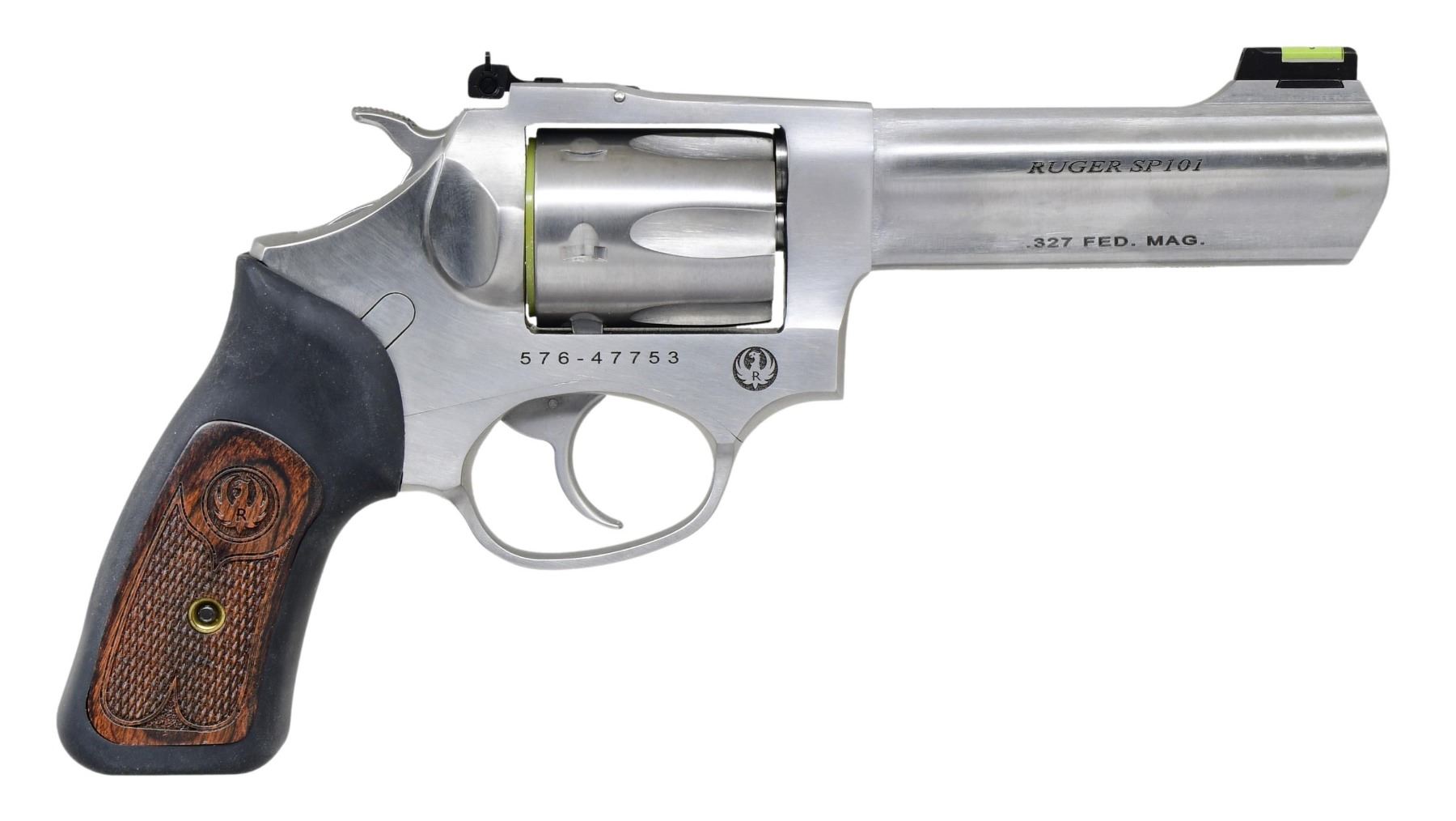Cal. 327 FED MAG S# 576-47753 This Ruger SP101 features a stainless steel finish with rubber grips and wood inserts. Produced from 1989 to the present, it has a 4.2-inch barrel, a fiber optic front sight, and an adjustable rear sight. The trigger is double-action with a standard hammer. The frame is stainless steel. The cylinder holds six rounds and is fluted. The grips are rubber with checkered wood inserts and Ruger medallions. UNATTACHED ACCESSORIES: Factory case, manual, and lock. CONDITION: Overall, the firearm is in excellent condition with minimal wear. The grips are in excellent condition with no noticeable wear. The bore is clean with strong rifling. MODERN (23-6110) $400 - $600.