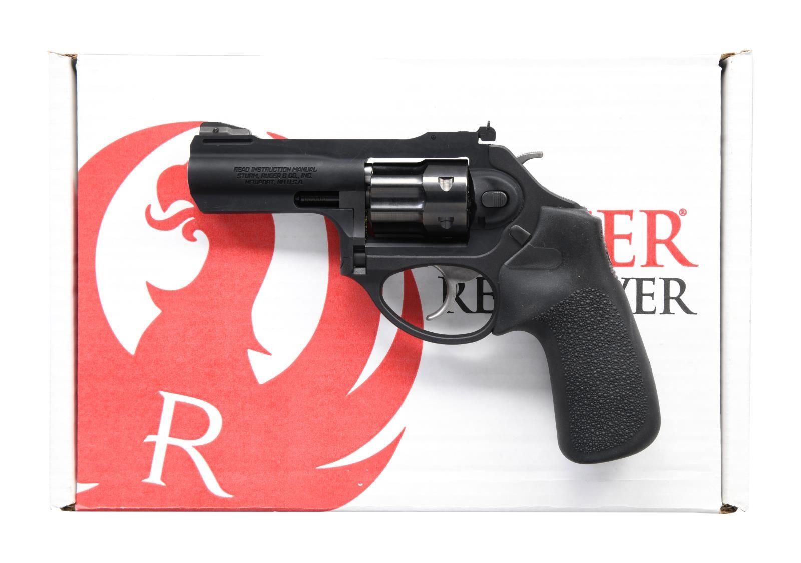 Cal. 22 MAG. S# 1541-52171. Bbl. 3", shrouded full lug, stainless, having pinned, serrated white bar blade sight; frame mounted adjustable rear. Mfg. 2018 in Newport, NH as Model 05437 having matte black finished monolithic aluminum frame. Extensive fluting on 6 round cylinder having PVD finish. Hogue Tamer monogrip with Ruger logo. Stainless trigger and exposed hammer, which allows single action use. UNATTACHED ACCESSORIES: factory box and lock; no manual (available free from Ruger). CONDITION: all aspects near excellent; appearing new and unfired. (24-39/NW). MODERN. $350-500.
