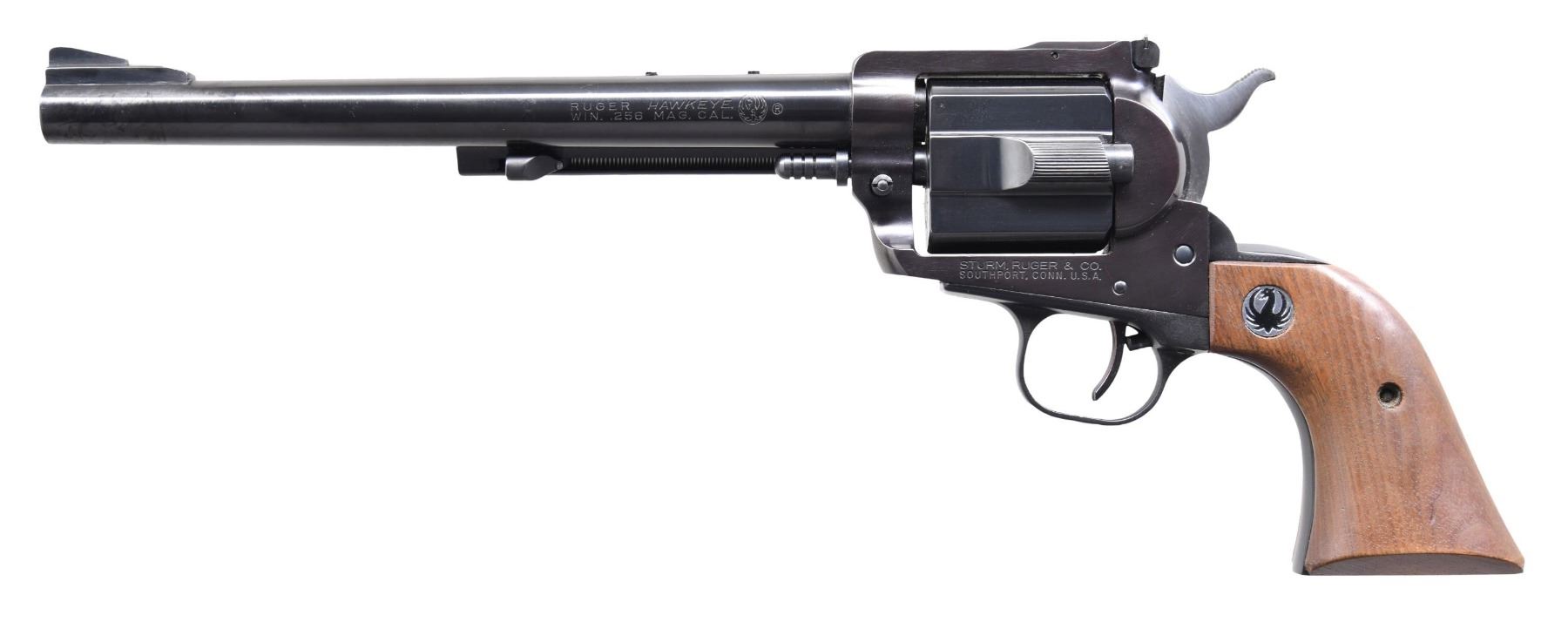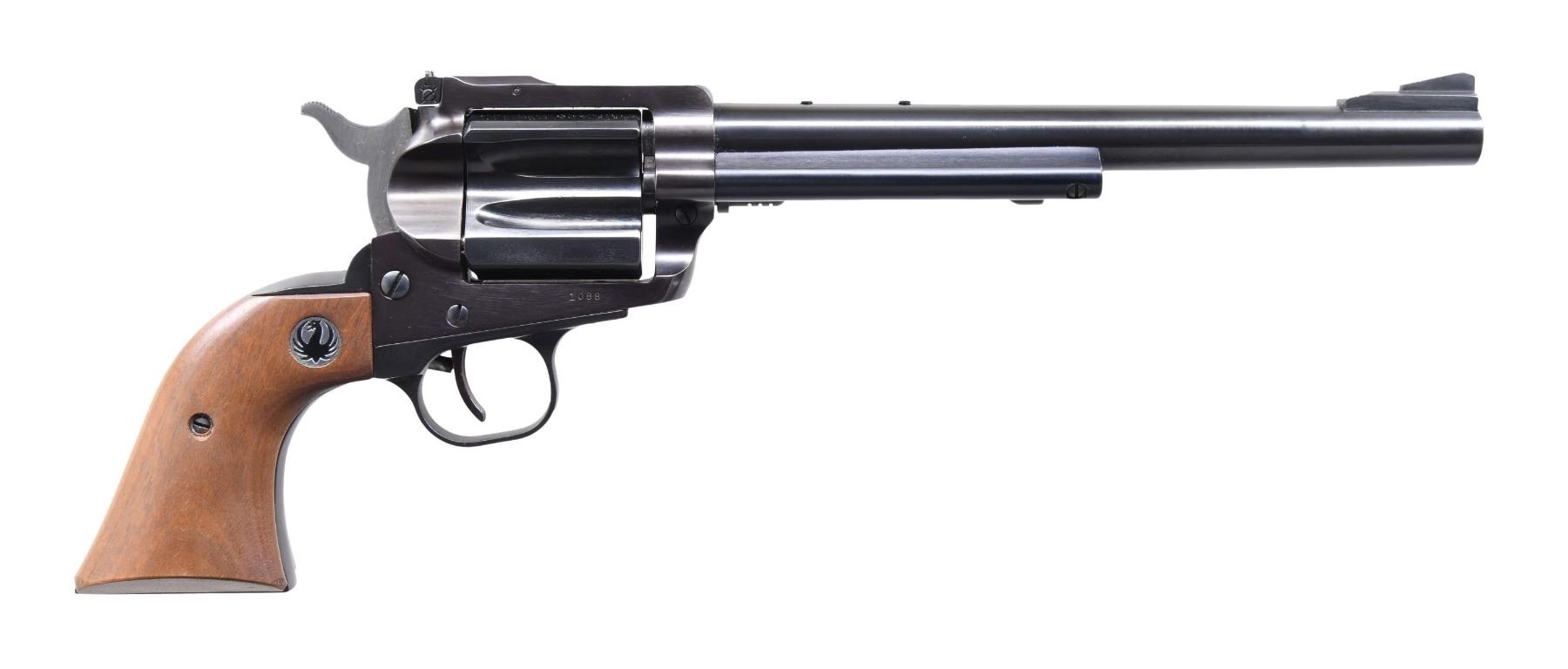 Cal. 256 Win. Mag. S# 1088. Bbl. 8 1/2" with ramped serrated blade front sight, factory drilled and tapped (with plug screws) near frame for scope mounting plus factory adjustable rear sight. Mfg. 1963 (1963-1964; approx 3,300 units) as based on Blackhawk revolver style frame having rotating breech block instead of cylinder. Loaded by inserting single cartridge into chamber at rear of barrel. Black anodized alloy ejector housing contains specially designed extractor. Wide serrated trigger as used on Super Blackhawks. Oiled walnut grips with black eagle medallions on XR3-RED anodized grip frame. CONDITION: factory quality refinish with near excellent overall appearance to include bore and grips. (23-6675/NW). CURIO. $1,500-2,000.